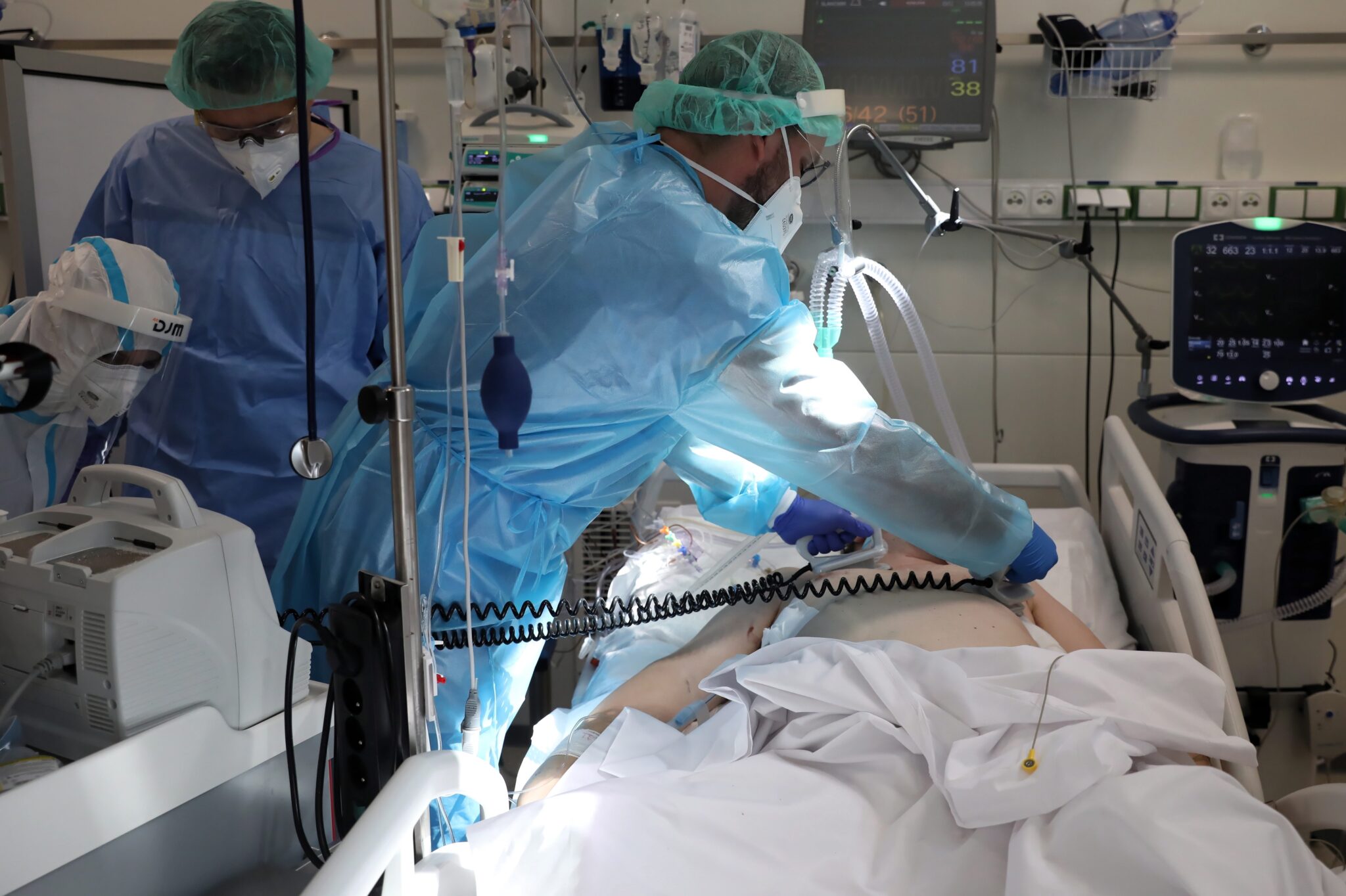 Warsaw (Poland), 22/04/2021.- Medical staff treat patients infected with coronavirus Covid-19 at the intensive care unit of the Modular Hospital of the Military Medical Institute in Warsaw, Poland, 22 April 2021. Polish Health Minister Niedzielski on 21 April announced easing of some coronavirus restrictions from 26 April in some part of Poland, including teaching of children from grades 1-3 in the hybrid system as well as the opening of beauty salons, hairdressing salons and cosmetic salons. (Abierto, Polonia, Varsovia) EFE/EPA/LESZEK SZYMANSKI POLAND OUT