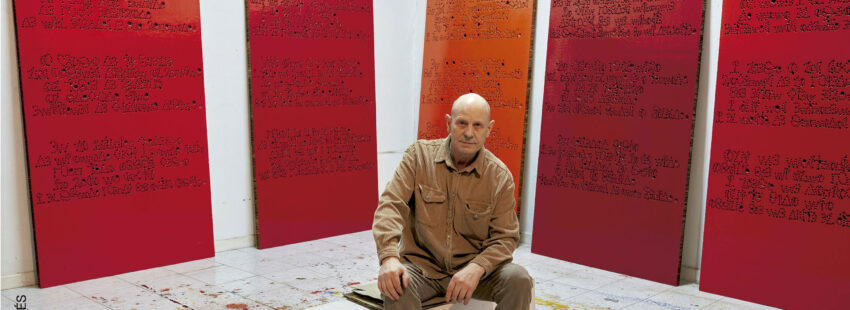 El artista encontró de nuevo el camino en su “noche oscura”. “A partir de ahí, he trabajado mi alfabeto y he ido tratando de desarrollar y de ampliar todo esto que parece que está en el aire, pero que el aire esté a nuestro favor no es fácil. Hace cuatro años, ya pensaba que estaba preparado para trabajar con san Juan de la Cruz y que era el momento”, reconoce. Lo hace con sus enormes “pictoescrituras”, grandes cartones de nido de abeja que pinta muchas veces de rojo, otras de ocre, algunas de naranja o amarillo, sobre los que fija capas de barniz, y con un punzón horada versos de san Juan de la Cruz.