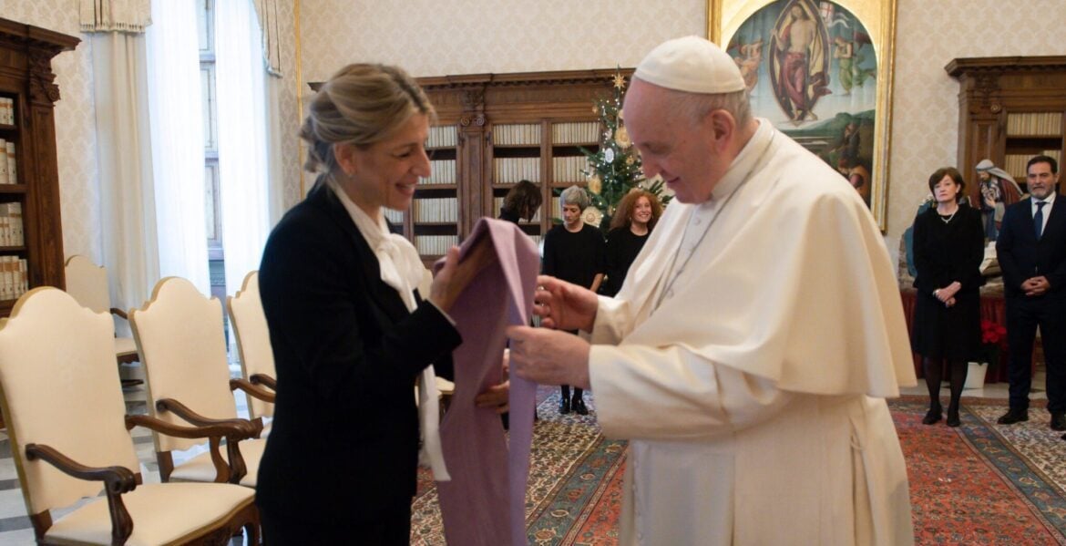 Vatican City (Vatican City State (holy See)), 11/12/2021.- A handout picture provided by the Vatican Media shows Pope Francis meeting with Spanish Minister of Labor and Social Economy Yolanda Diaz Perez (L) in Vatican, 11 December 2021. (Papa, España) EFE/EPA/VATICAN MEDIA HANDOUT HANDOUT EDITORIAL USE ONLY/NO SALES