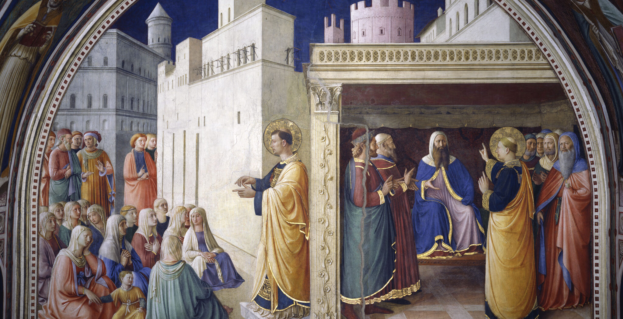 Tras un camino laberíntico, nos encontramos frente a una pequeña puerta. Tan pronto como cruzamos el umbral, nos baña una luz cálida y dorada. La capilla está dedicada a los Santos Esteban y Lorenzo. En la parte central, al entrar por la derecha, aparece un fresco que narra el episodio de San Esteban y la disputa en el Sanedrín. El santo está de pie. Frente a él, un grupo de mujeres sentadas en el suelo le escuchan, algunas atentamente y otras más distraídas. Los hombres se encuentran al fondo.