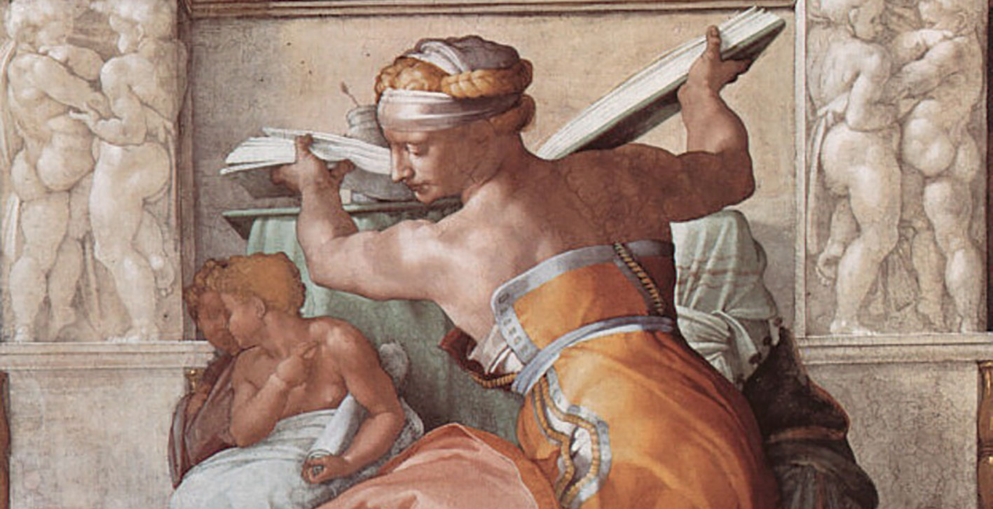 Vamos ahora a la Capilla Sixtina. Pero no nos detenemos en el Juicio Final. Barbara Jatta nos dice que miremos hacia arriba, hacia las Sibilas, esas majestuosas figuras de mujeres pintadas al fresco por Miguel Ángel Buonarroti entre 1508 y 1512. “Siempre me han llamado la atención porque son mensajeras de la Palabra y son imponentes. Incluso se ven algo masculinas. La Délfica y la Líbica son figuras maravillosas y muy interesantes. Son mujeres que ven las cosas antes que los demás”. Nos detenemos a observar la Délfica. Tiene un pergamino en la mano y su mirada en sentido opuesto al de su cuerpo, como si algo o alguien la hubiera distraído mientras lo estaba leyendo.