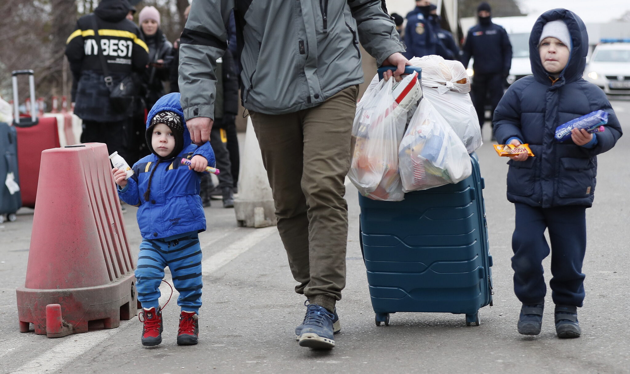 Siret (Romania), 26/02/2022.- A Ukrainian family passes trough the Romanian-Ukrainian border crossing point in Siret, Romania, 26 February 2022. Romanian authorities decided to make an exception regarding Covid-19 quarantine for all refugees entering Romania from Ukraine. Russian troops entered Ukraine on 24 February prompting the country's president to declare martial law and triggering a series of announcements by Western countries to impose severe economic sanctions on Russia. (Rumanía, Rusia, Ucrania) EFE/EPA/ROBERT GHEMENT