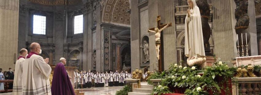 La consagración se realizó tras la celebración penitencial en la que el pontífice –tras celebrar de manera individual el sacramento– confesó a unos fieles. Como hiciera Juan Pablo II, ante una imagen de la Virgen de Fátima colocada sobre el altar principal de la basílica Vaticana, el papa Francisco dirigió la oración publicada hace unos días en la que señala que “ponemos nuestra confianza en ti. Estamos seguros de que tú, sobre todo en estos momentos de prueba, no desprecias nuestras súplicas y acudes en nuestro auxilio”.