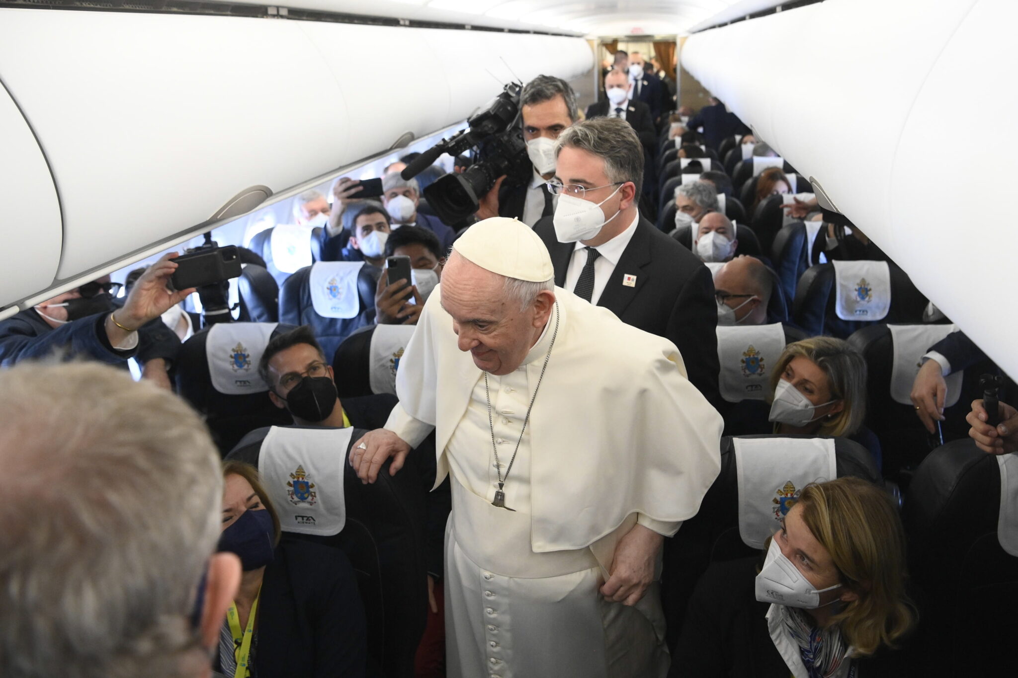 In Air (Malta), 02/04/2022.- A handout picture provided by the Vatican Media shows Pope Francis standing aboard the plane on his way to Malta International Airport, ahead of his apostolic visit in Luqa, Malta, 02 April 2022. Pope Francis departs for a two-day trip to Malta. (Papa) EFE/EPA/VATICAN MEDIA HANDOUT HANDOUT EDITORIAL USE ONLY/NO SALES