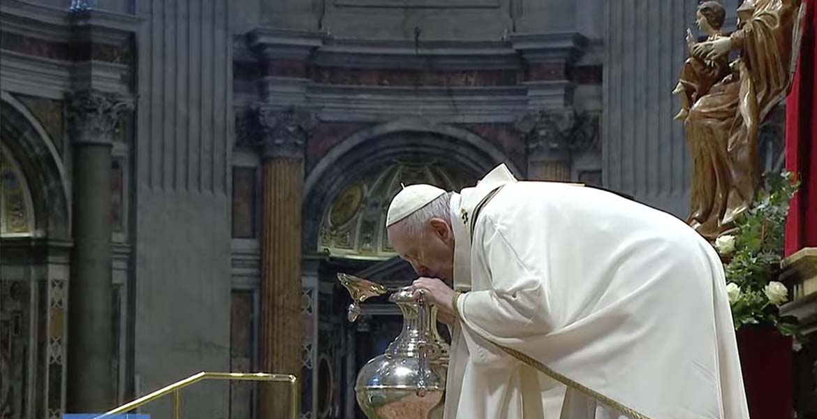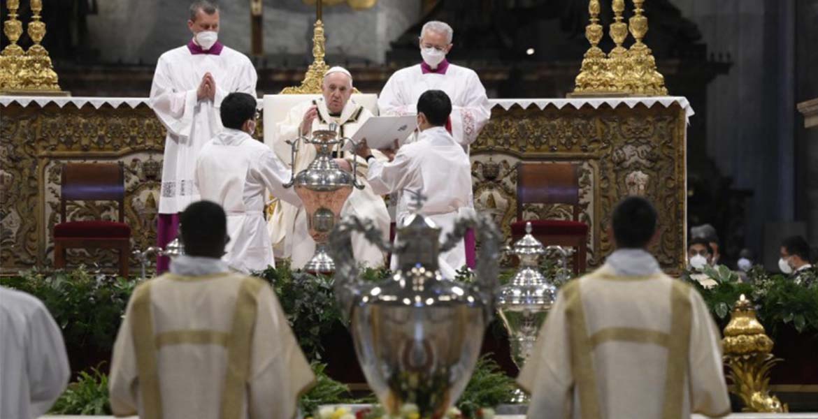 Tras el paréntesis del 2020, el papa Francisco finalmente ha restablecido la normalidad de la mañana del Jueves Santo y junto con una representación del consejo presbiteral de la diócesis de Roma, así con diferentes fieles, ha presidido la Misa Crismal en la Basílica de San Pedro. Los presbíteros presentes, unos 1.800 entre curas, obispos y cardenales, durante esta celebración, han renovado sus promesas sacerdotales ante el obispo de Roma y el pontífice ha consagrado el crisma y bendecido los Santos Óleos como marca la tradición. Al ir recuperando el aforo en la basílica a la reducción la eucaristía se ha celebrado en el altar de la Confesión y se ha rescatado la procesión con las ánforas de los óleos, que hace un año estaban simplemente situadas frente al altar desde el inicio de la celebración. Además, los fieles se han preparado para la misa rezando la hora de Tercia.