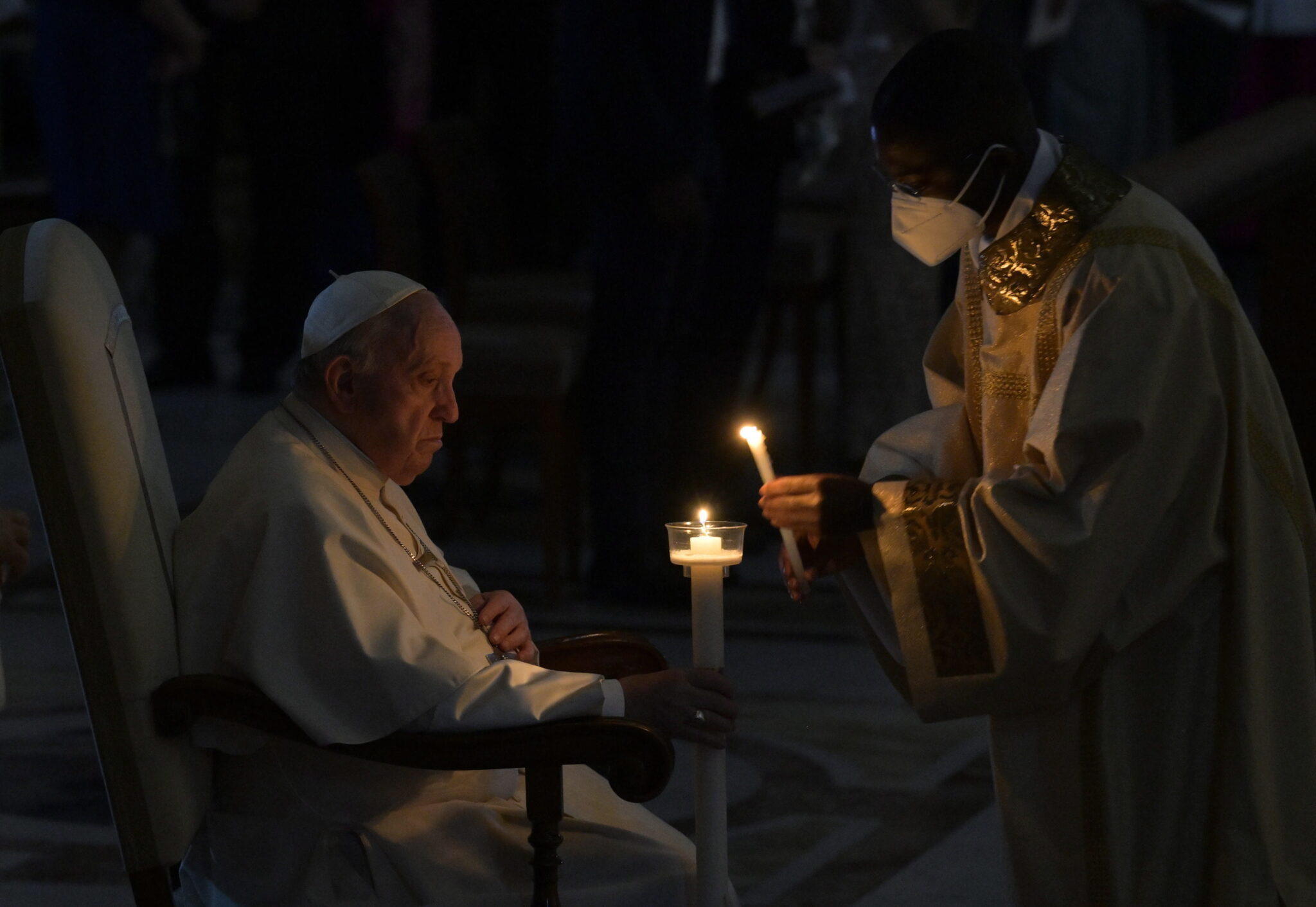 Vatican City (Vatican City State (holy See)), 16/04/2022.- Pope Francis (L) holds a candle as he attends the Easter Vigil Mass in Saint Peter's Basilica at the Vatican, 16 April 2022. (Papa) EFE/EPA/CLAUDIO PERI