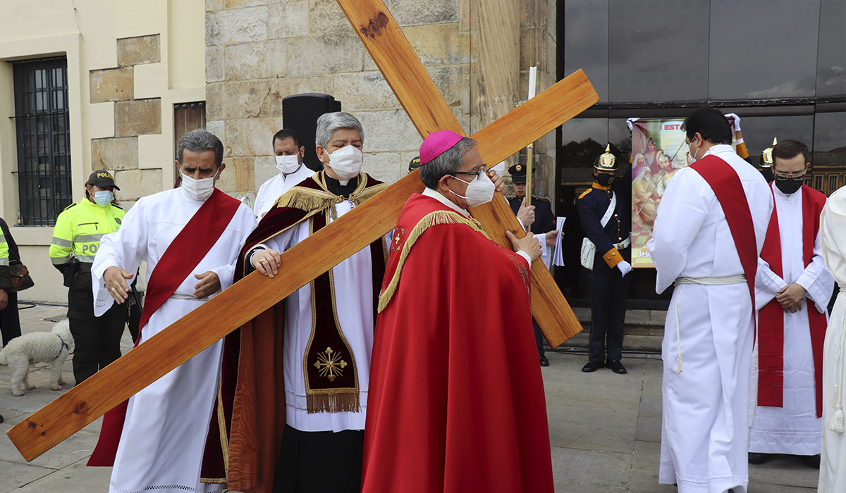 El Viernes Santo fue representado el viacrucis en el centro de Bogotá, encabezado por Luis José Rueda, arzobispo local y presidente de la Conferencia de Obispos de Colombia, quien –cruz al hombro– recorrió las calles de la capital para clamar por la verdad, la paz y la reconciliación.