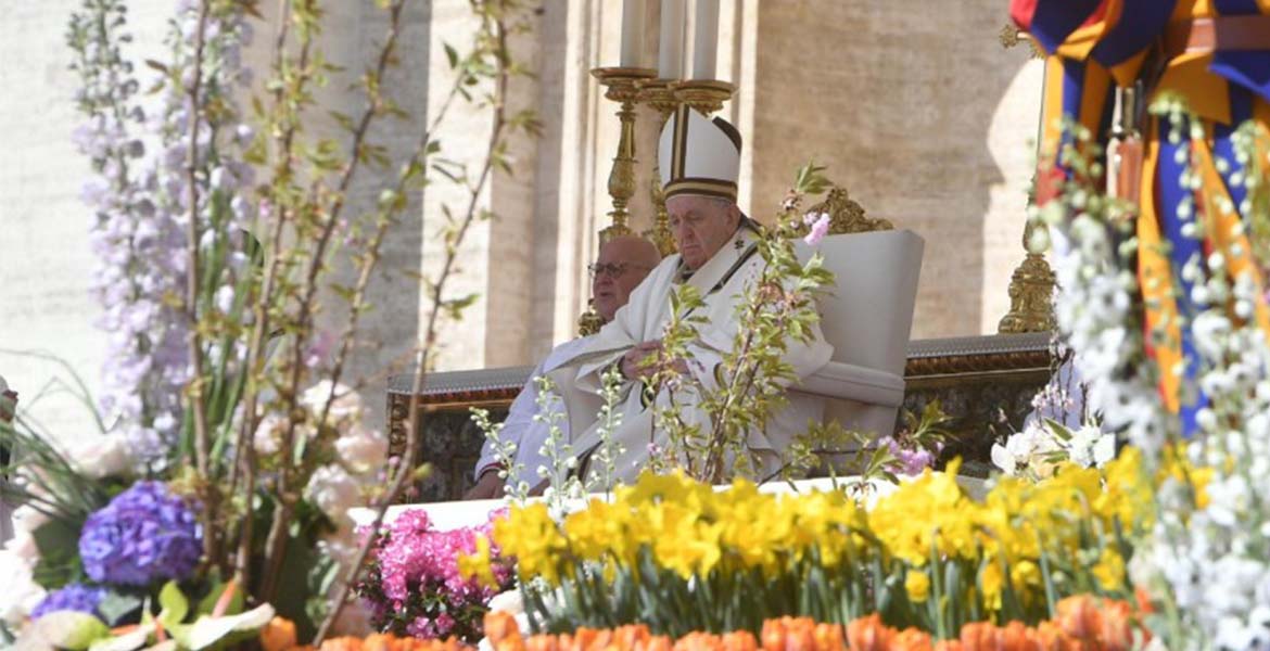 En la Misa de Pascua del Vaticano el papa Francisco ha continuado este año la práctica habitual de no realizar la homilía, el discurso principal de la jornada queda para la bendición Urbi et Orbi, la más solemne de los pontífices. Además, están aún presentes las palabras de la Vigilia Pascual, la noche anterior, en la que el pontífice tuvo que ceder la presidencia al cardenal Giovanni Battista Re como decano del Colegio Cardenalicio, debido a su dolencia en la rodilla derecha. En dicha homilía alabó el testimonio de las mujeres que fueron al sepulcro de Jesús y tendió la mano a una delegación de políticos ucranianos.