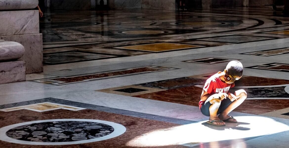 Vatican City (Italy), 12/07/2020.- A child crouches down to look at his shadow on the floor inside of St. Peter's Basilica in the Vatican, 12 July 2020. The strong heat of the past few days forces the few tourists to cool off in the cool open places like churches. (Italia, Roma) EFE/EPA/LUCIANO DEL CASTILLO