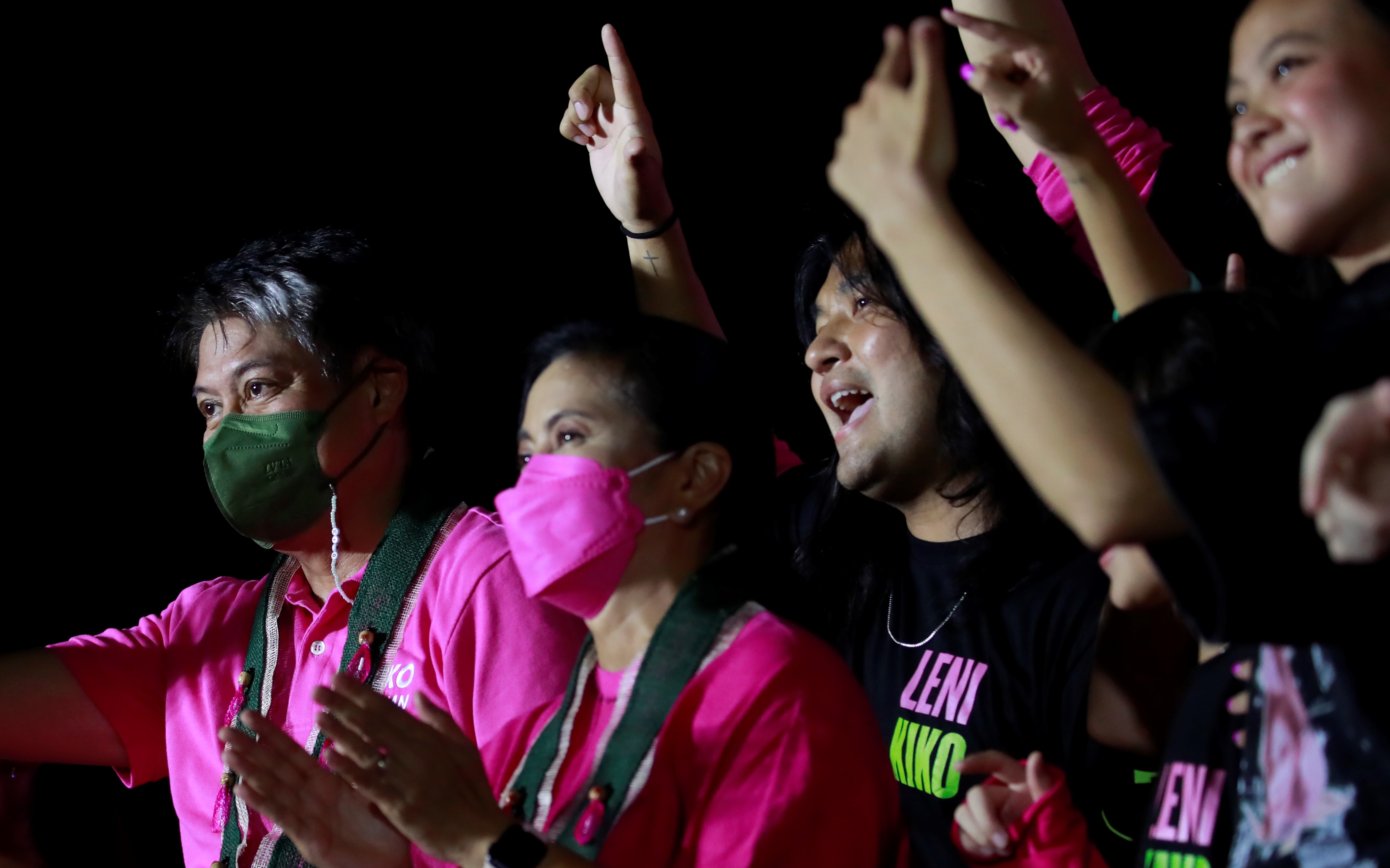 Manila (Philippines), 29/04/2022.- Philippine Vice President Leni Robredo (3-L), a presidential contender in the May 2022 national elections, and Senator Francis 'Kiko' Pangilinan (2-L), running for Vice-president, gesture during a campaign rally in Santa Rosa, Laguna province, Philippines, 29 April 2022. Presidential elections are scheduled for 09 May 2022. (Elecciones, Filipinas) EFE/EPA/FRANCIS R. MALASIG