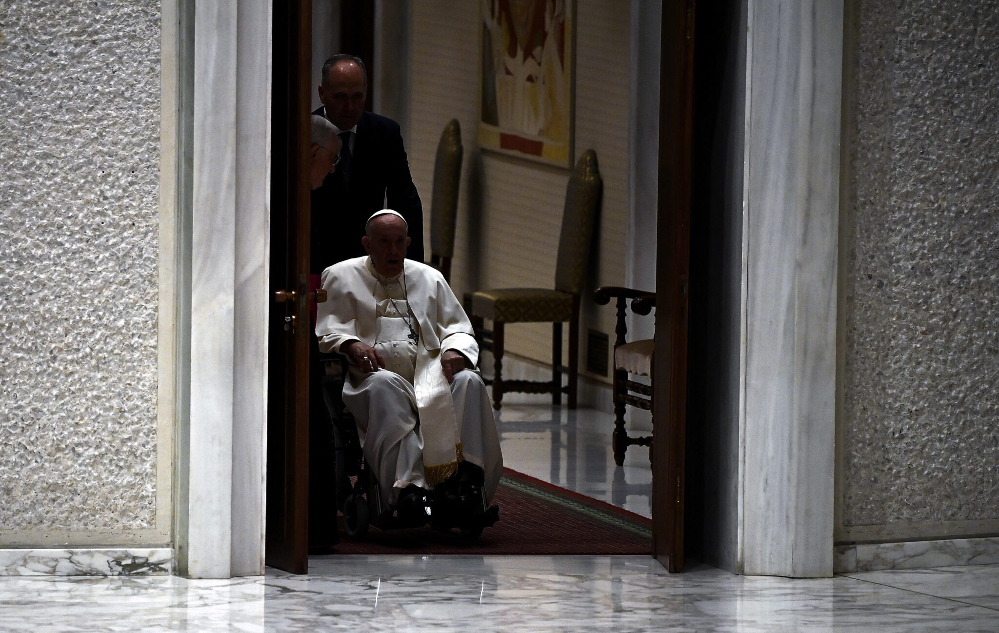 Vatican City (Vatican City State (holy See)), 14/05/2022.- Pope Francis in a wheelchair attends an audience with pilgrims of the Institute of the Religious Teachers Filippini in the Paul VI hall, Vatican City, 14 May 2022. (Papa) EFE/EPA/ANSA/RICCARDO ANTIMIANI