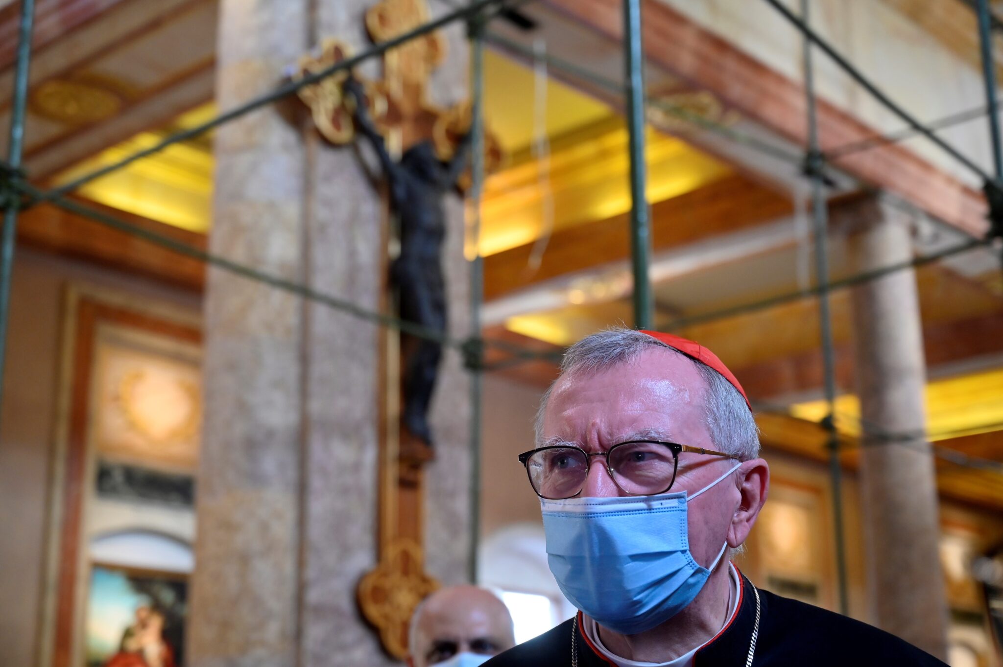 Beirut (Lebanon), 03/09/2020.- Vatican Secretary of State Italian Cardinal Pietro Parolin visits the Christian Maronites Church of Saint Georges that was damaged following a huge explosion that rocked the city in Beirut, Lebanon, 03 September 2020. According to Lebanese Health Ministry, at least 190 people were killed, and more than six thousand injured in the Beirut blast that devastated the port area on 04 August and believed to have been caused by an estimated 2,750 tons of ammonium nitrate stored in a warehouse. (Líbano, Estados Unidos) EFE/EPA/WAEL HAMZEH