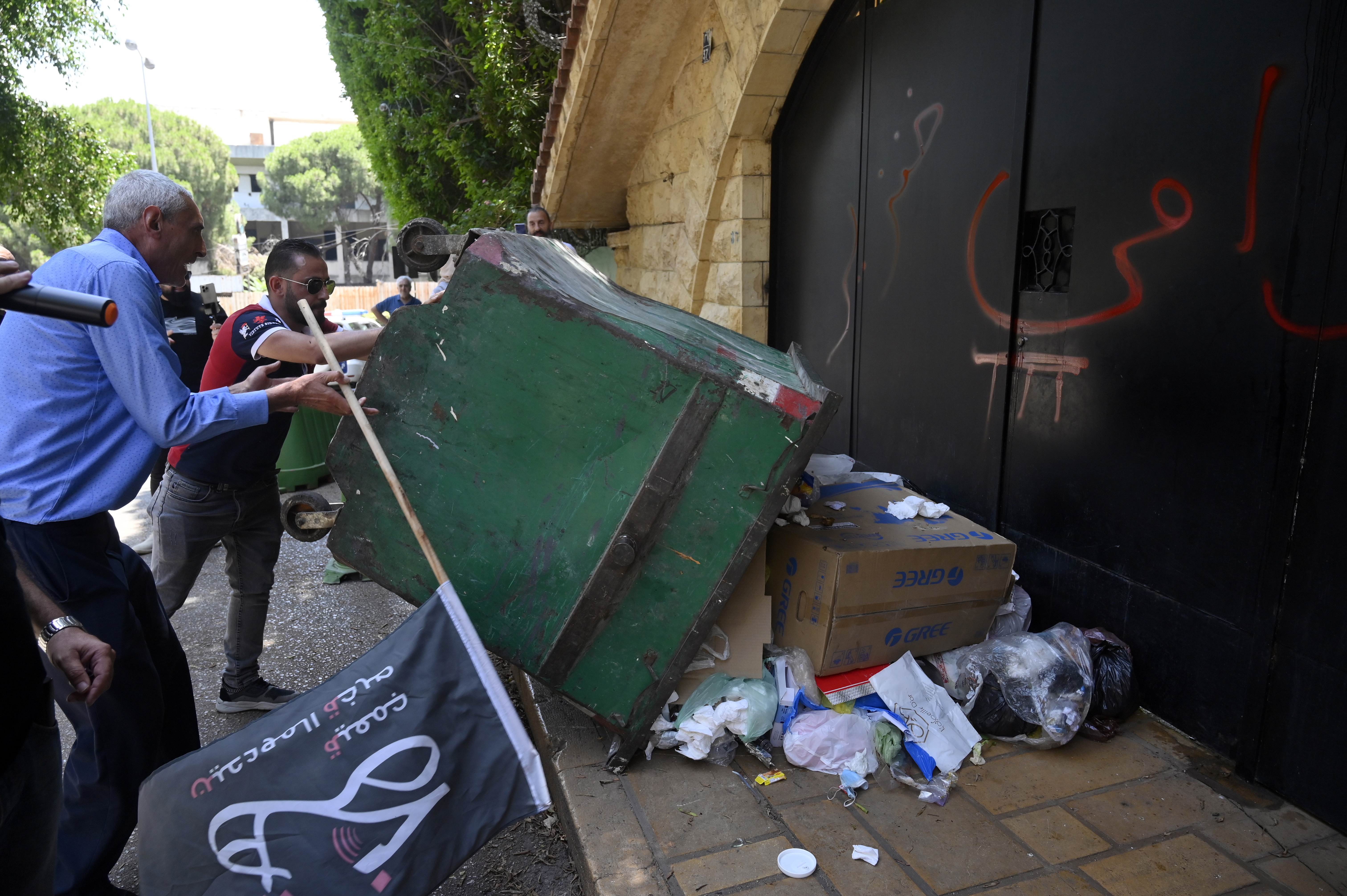 Beirut (Lebanon), 11/06/2022.- Lebanese Bank customers empty the garbage bin in front of the entrance to the house of the Chairman and Chief Executive of Bank of Beirut in Beirut and President of the Association of Banks in Lebanon Salim Sfeir, during a protest in Sin El Fil area north of Beirut, Lebanon, 11 June 2022. Bank customers demand that they be allowed to withdraw their deposits that have been blocked amid the economic crisis in the country as the Lebanese pound has lost about 90 percent of its value against the dollar and to reject the Capital Control Law. Lebanon has been struggling with compounded crises for nearly two years, including the economic and financial crisis, the covid-19 pandemic and the explosion of the Beirut port. The World Bank says the economic crisis in the country is possibly among top three most severe crises episodes globally since the mid-nineteenth century. (Protestas, Líbano) EFE/EPA/WAEL HAMZEH