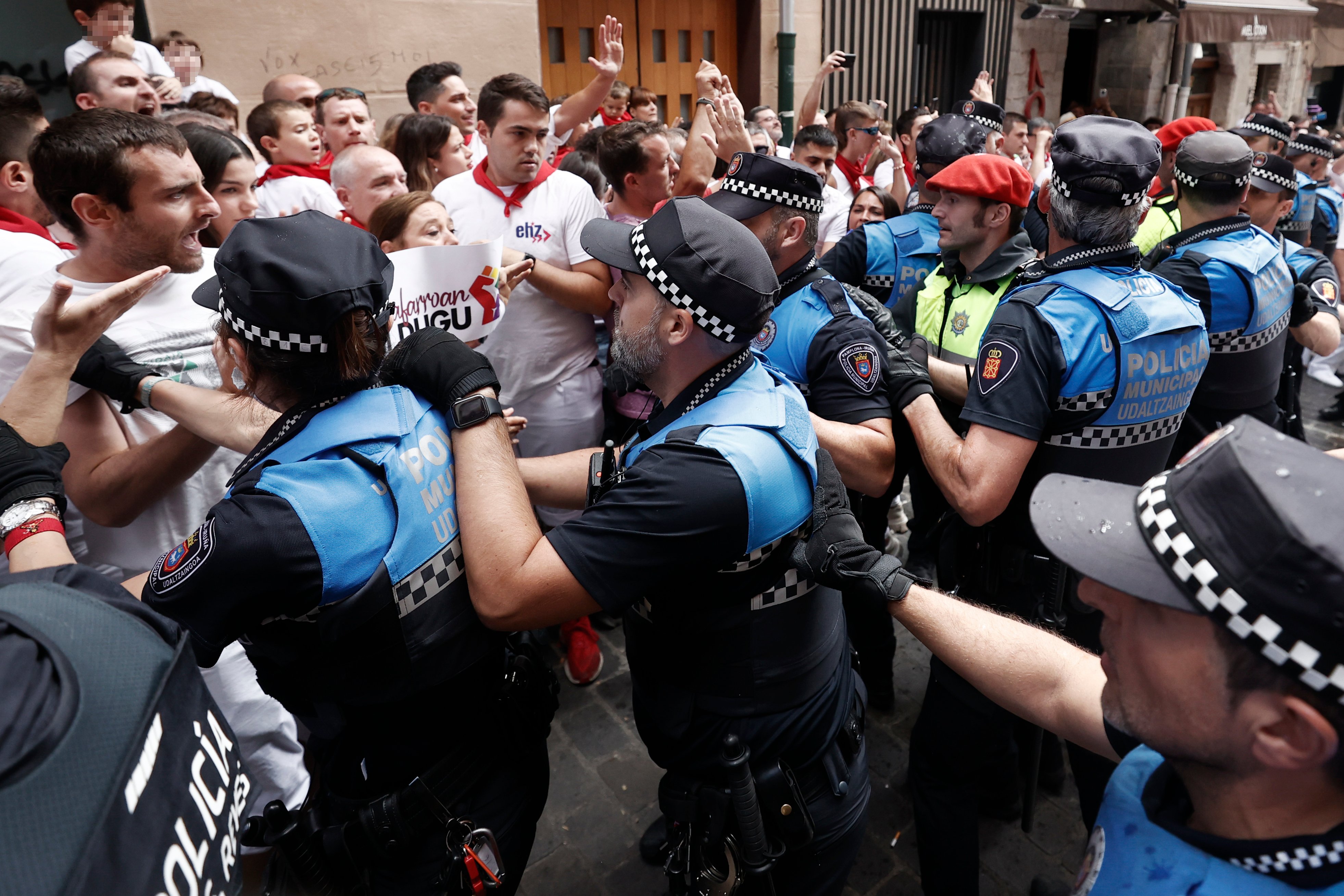 GRAFCAV7323. PAMPLONA, 07/07/2022.- Agentes municipales en la calle Curia durante los momentos de mucha tensión que se han producido cuando un grupo de personas ha increpado a la corporación donde se encontraba el alcalde Enrique Maya y han mantenido forcejeos con la Policía Municipal en el regreso a la catedral al termino de la procesión de San Fermin. Al menos tres agentes han resultado heridos y uno ha sido trasladado en ambulancia al Hospital Universitario de Navarra. EFE/ Jesús Diges