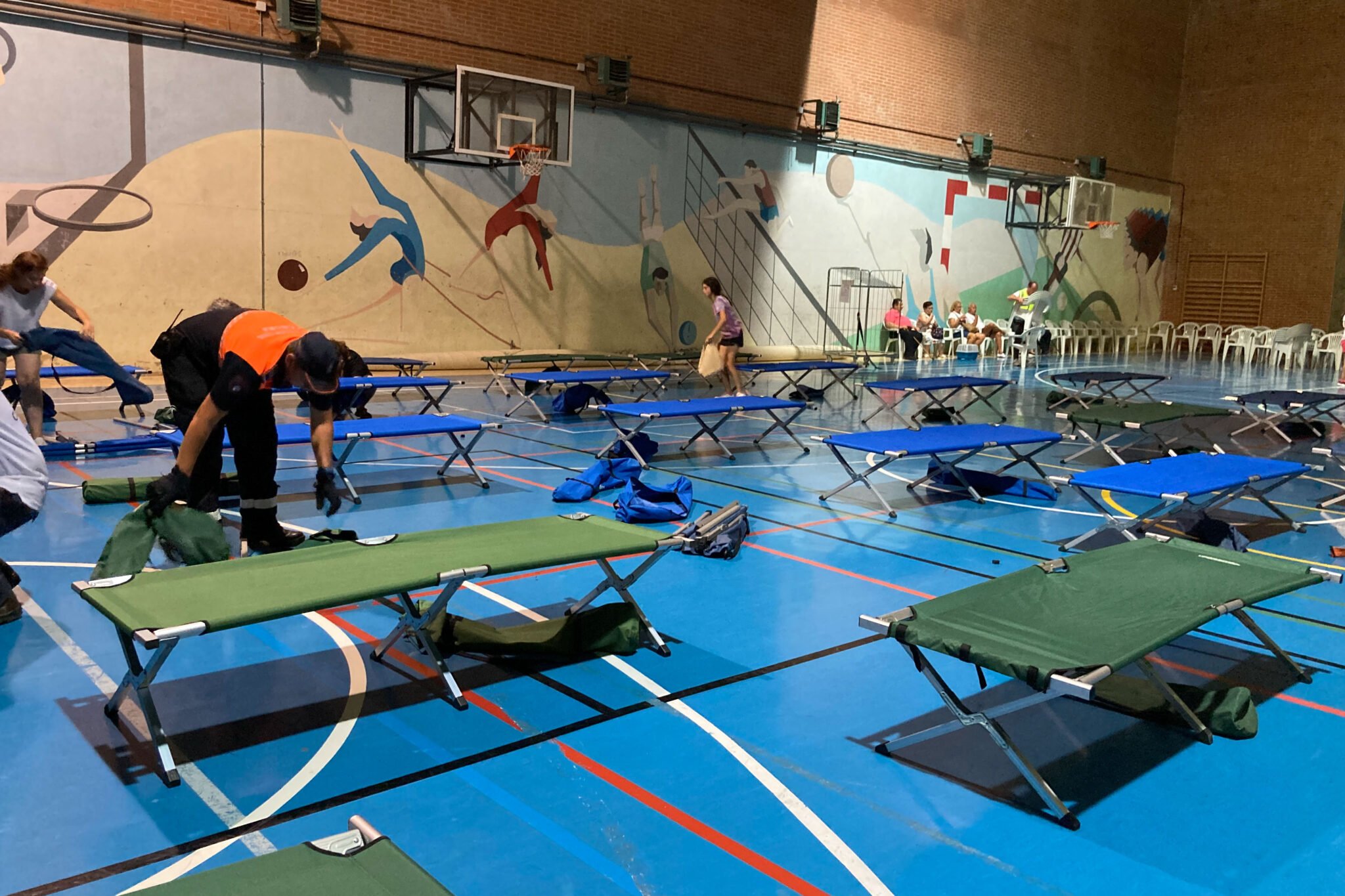 ZAMORA, 18/07/2022.- Miembros de Protección Civil acondicionan la ciudad deportiva de Zamora donde serán alojados los vecinos de Ferreruela de Tábara tras ser evacuados por la proximidad del incendio forestal que se extiende por la comarca de Tábara. EFE/Mariam A. Montesinos.