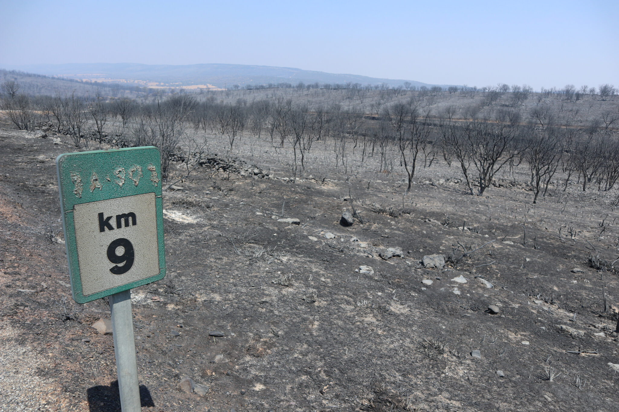 SAN MARTIN DE TÁBARA (ZAMORA), 20/07/2022.- Vista de la zona de San Martín de Tábara (Zamora), afectada por el incendio forestal de Losacio (Zamora). El tramo del AVE Madrid-Galicia que permanecía cortado y todas las carreteras que seguían cerradas al tráfico por el incendio se han reabierto este miércoles por la mañana. Los más de 2.000 vecinos de los 14 pueblos que permanecían desalojados de los 34 que hubo que evacuar, han podido regresar a sus casas este miércoles ante la evolución favorable de los trabajos de extinción que hacen que el incendio esté ya sin llama, aunque siga activo. EFE/Mariam A. Montesinos
