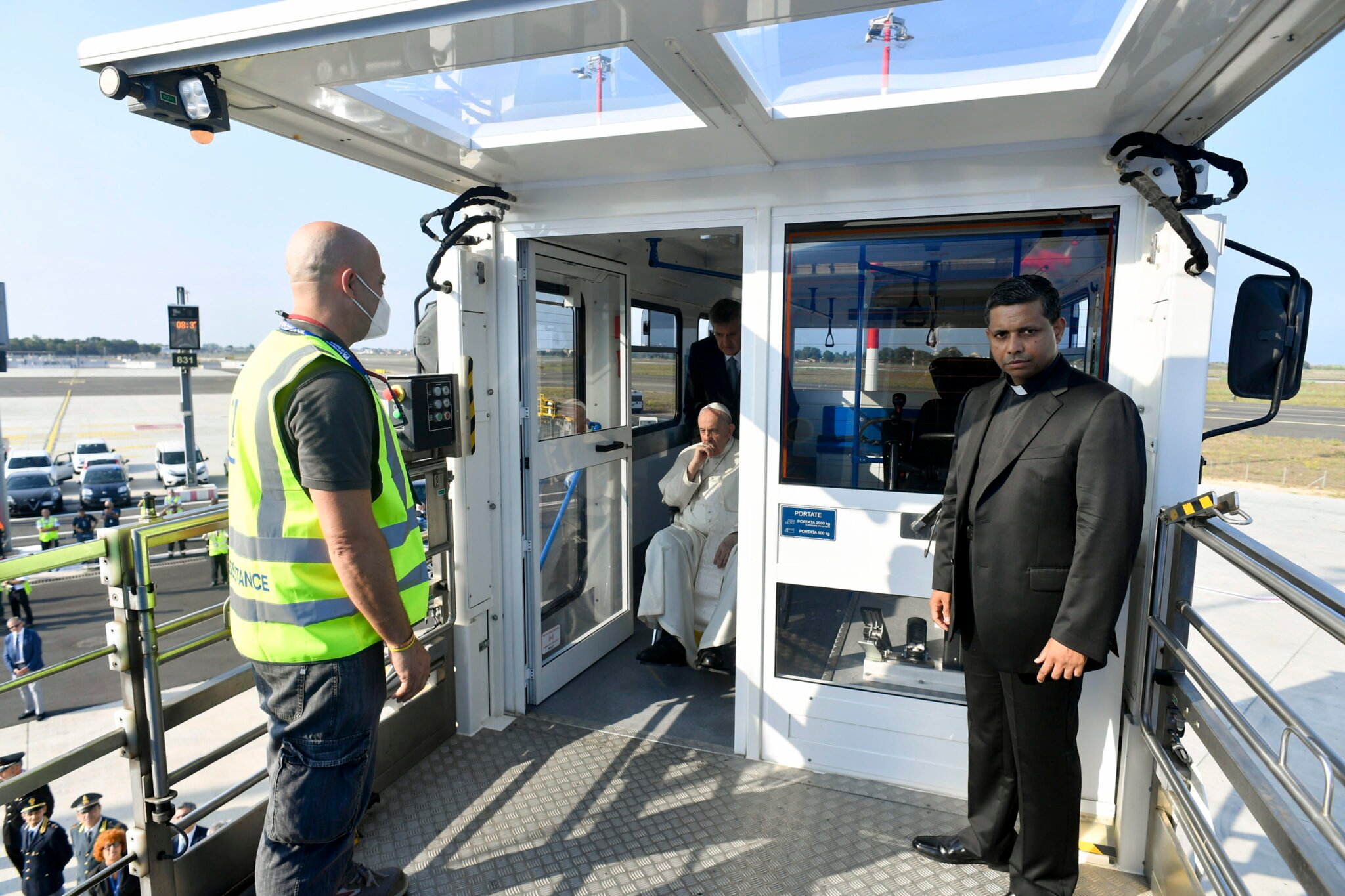Fiumicino, Rome (Italy), 24/07/2022.- A handout photo made available by the Vatican Press Office shows Pope Francis lifted aboard the airplane that will take him to Canada for his apostolic journey, at Leonardo Da Vinci Airport, Fiumicino, Italy, 24 July 2022. The six-days visit is the first papal visit to Canada in 20 years. (Papa, Italia) EFE/EPA/VATICAN PRESS OFFICE HANDOUT HANDOUT EDITORIAL USE ONLY/NO SALES
