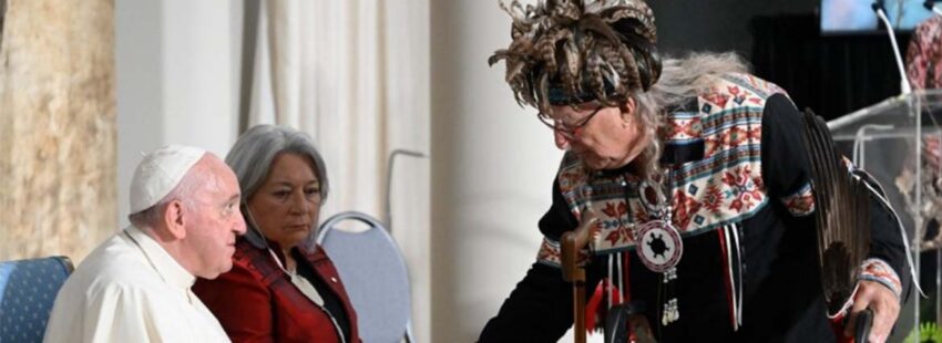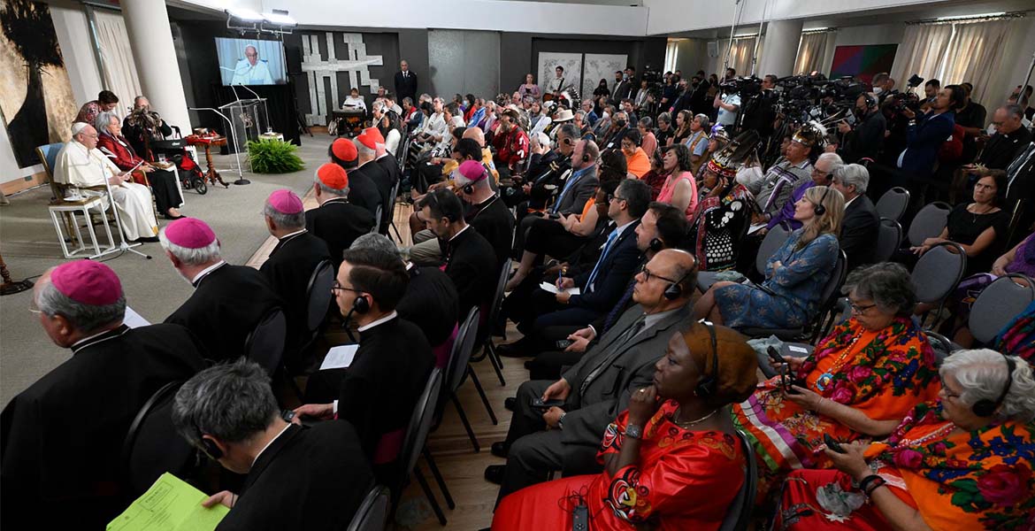 Alabando los valores presentes en las culturas indígenas, invitó a “sanar los dañinos hábitos de explotar la creación, las relaciones, el tiempo” y el utilitarismo. Condenando las “políticas de asimilación y desvinculación que incluían las escuelas residenciales y que dañaron a muchas familias indígenas minusvalorando su lengua, su cultura, su visión del mundo”. Señaló la “vergüenza y dolor” por la implicación de instituciones eclesiales locales, ante lo que “junto a los obispos de este país” renovó su “petición de perdón por el mal cometido, que tantos cristianos cometieron contra los pueblos indígenas” frente al mensaje del evangelio.