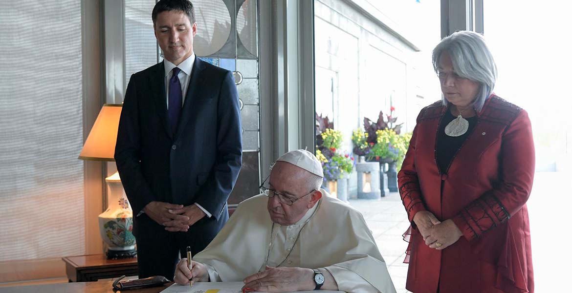 Tras los encuentros privados, se ha organizado uno de carácter público con las autoridades civiles, los representantes de los pueblos indígenas y el Cuerpo Diplomático, donde el papa Francisco ha podido dirigir un discurso. Antes Trudeau en su intervención recordó a los niños indígenas que han sufrido diversos abusos en el pasado en los internados regentados por la Iglesia católica en el país e hizo una llamada a la reconciliación. Simon, en su intervención –que hizo sentada como el Papa e, incluso, en el mismo tipo de silla–, dio la bienvenida Bergoglio, presentó al grupo presente en la sala y agradeció al pontífice que hubiera emprendido esta peregrinación penitencial a Canadá. La gobernadora también puso voz a la familia de los supervivientes de las residencias católicas para indígenas para hacer una llamada a la reconciliación.