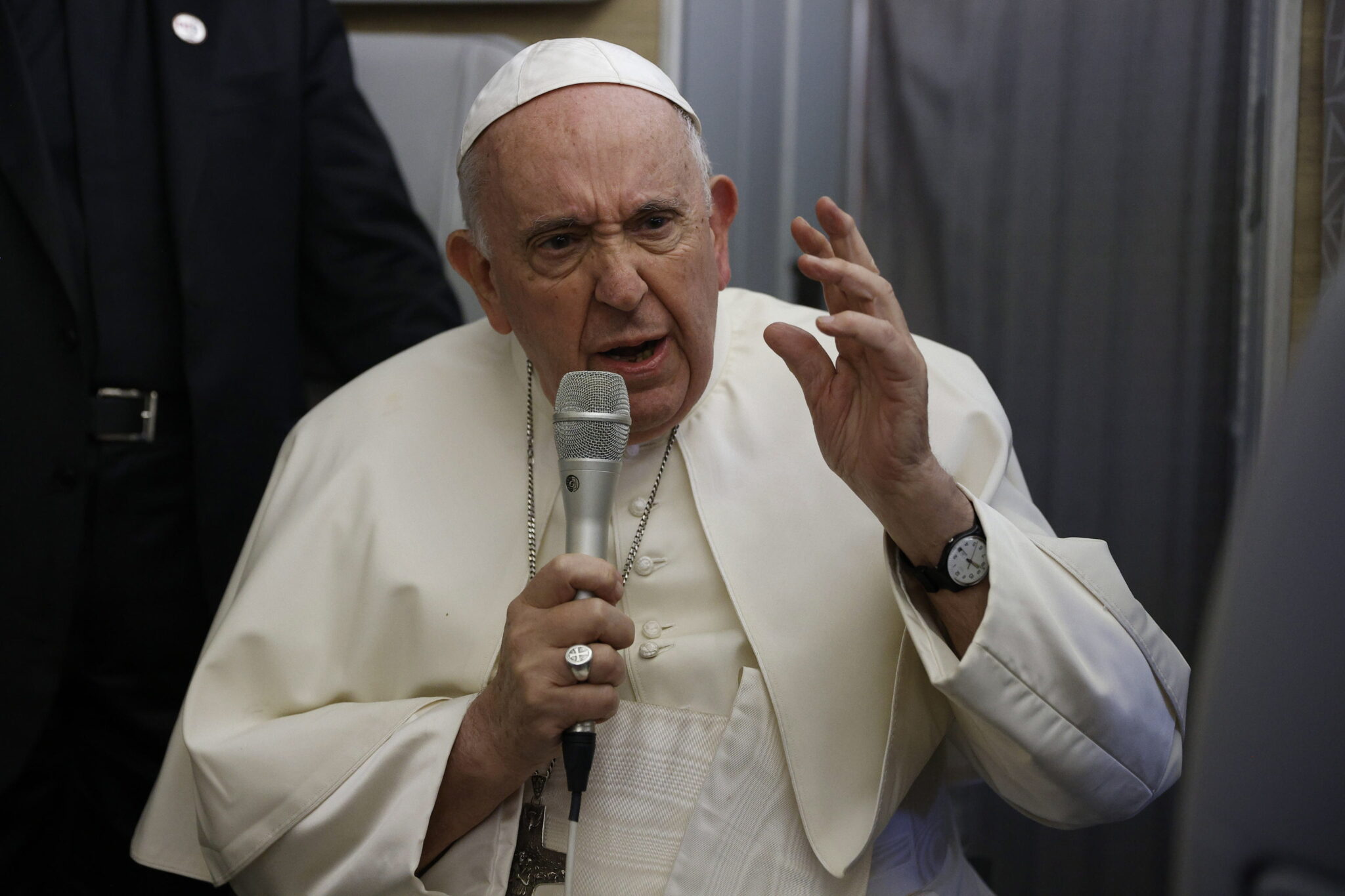 In Air (---), 30/07/2022.- Pope Francis holds a news conference aboard the papal plane on his flight back after visiting Canada, 30 July 2022. (Papa) EFE/EPA/GUGLIELMO MANGIAPANE / POOL