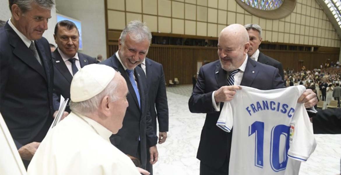 El equipo de fútbol canario está celebrando su primer centenario y ha querido que “uno de los actos centrales” de la entidad blanquiazul a lo largo de este 2022 sea el encuentro con el pontífice. Por ello, al frente de la delegación en la audiencia general ha estado su presidente Miguel Concepción. También ha estado acompañado por el presidente de Canarias, Ángel Víctor Torres Pérez, o el presidente del Cabildo de Tenerife, Pedro Martín.