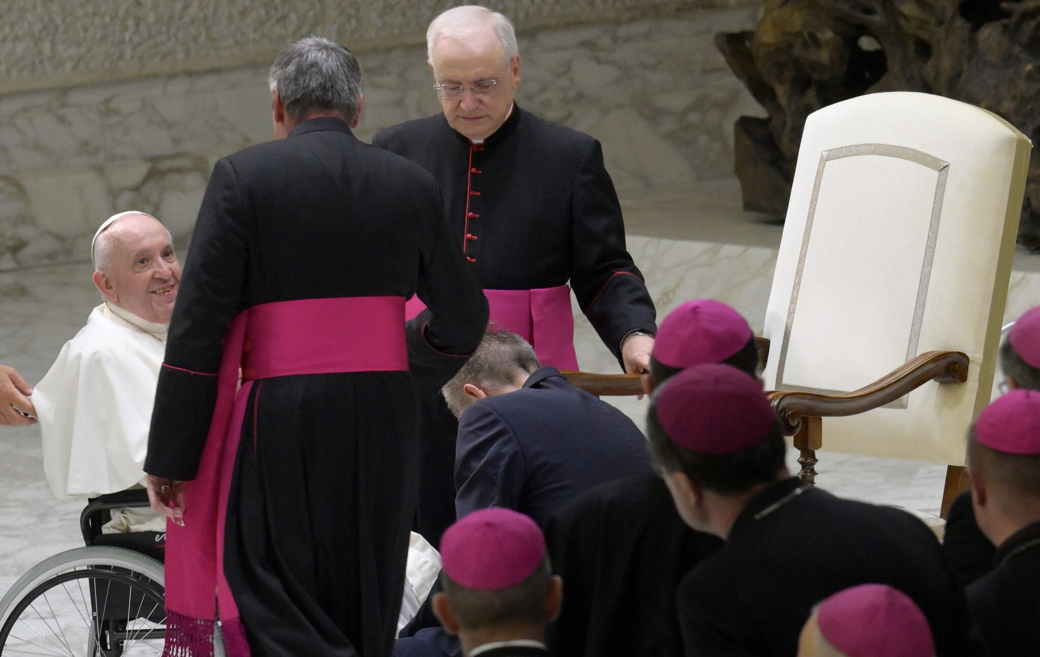 Vatican City (Vatican City State (holy See)), 26/08/2022.- Pope Francis (L) arrives to an audience in the framework of the pilgrimage of French altar servers to Rome, at Nervi Hall in Vatican City, Vatican, 26 August 2022. The pilgrimage is held between 22 and 26 August under the theme 'Come, Serve and Go'. (Papa, Roma) EFE/EPA/ANSA/CLAUDIO PERI