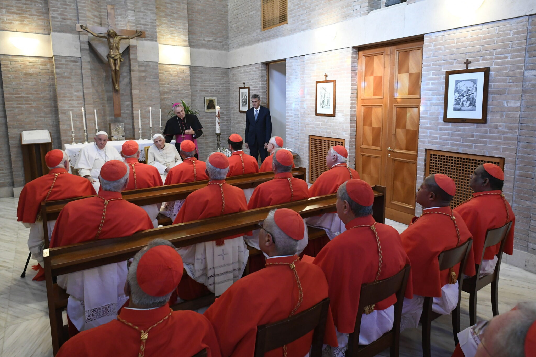 Los nuevos miembros del colegio cardenalicio fueron bendecidos por el predecesor de Francisco en la capilla del monasterio, que estuvo acompañado en todo momento por su secretario personal, Georg Ganswein. Tal y como informan los medios vaticanos, la cita se redujo a un “breve saludo” y al rezo comunitario de la oración mariana de la la Salve Regina.