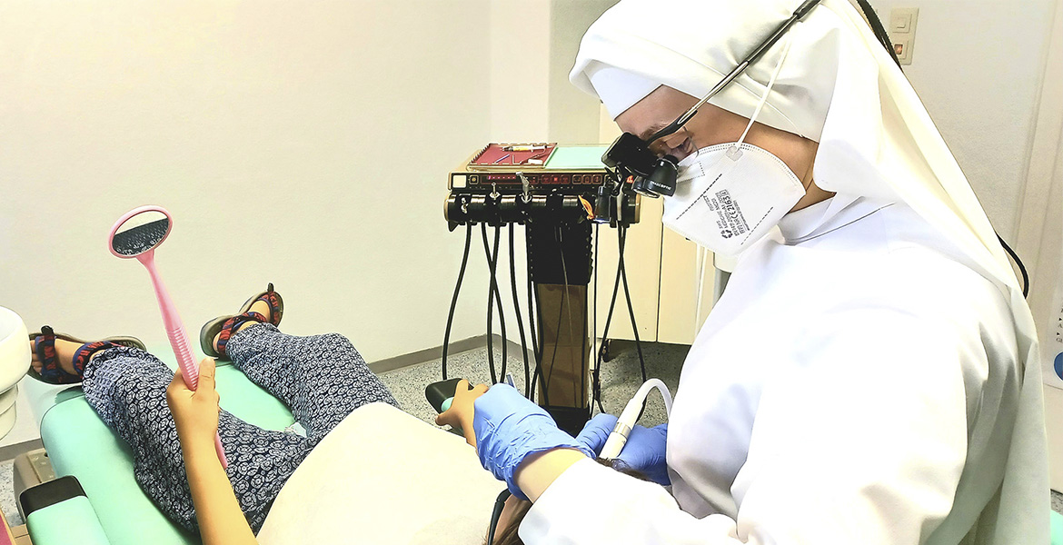 La congregación, explica, está más centrada “en el ámbito educativo, pero en todo lo que hacemos podemos irradiar el amor de Dios. Sin embargo, siempre hemos sido una comunidad apostólica activa”. Un testimonio que trasluce llevando siempre el hábito religioso y la toca cuando trabaja como dentista. “No llevo el vestido negro de fiesta, sino ropa especial de trabajo. Se trata de un vestido blanco de bata con un velo blanco. Ambos son fáciles de limpiar y, por tanto, higiénicos. En el pasado, las monjas que trabajaban en el hospital siempre llevaban este hábito especial. Es muy práctico. Creo que es bonito poder mostrar mi vocación hacia el exterior”.