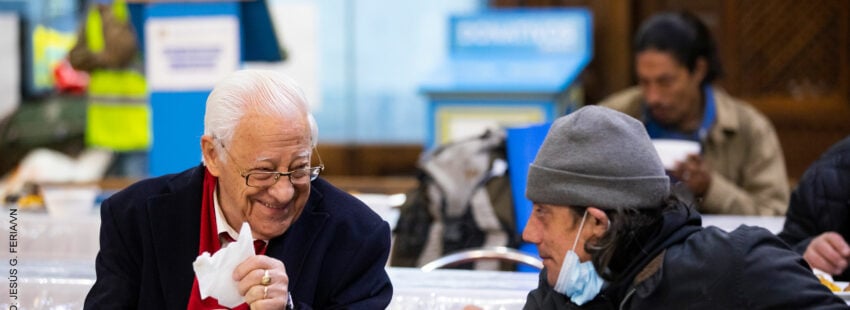 Ahora sí, el padre Ángel puede tomar el pan y el vino en una mesa en la que caben todos. En cuanto concluye la liturgia, baja los cuatro escalones, coge un tazón y se sienta al lado de sus invitados como uno más, haciéndose el encontradizo, buscando conversación para ver cómo se le podría rescatar de la calle. Pero también para que no se le olvide que el resto de su implacable agenda salpicada de políticos, empresarios y gente del colorín solo tiene sentido si empieza y termina con y por los últimos.