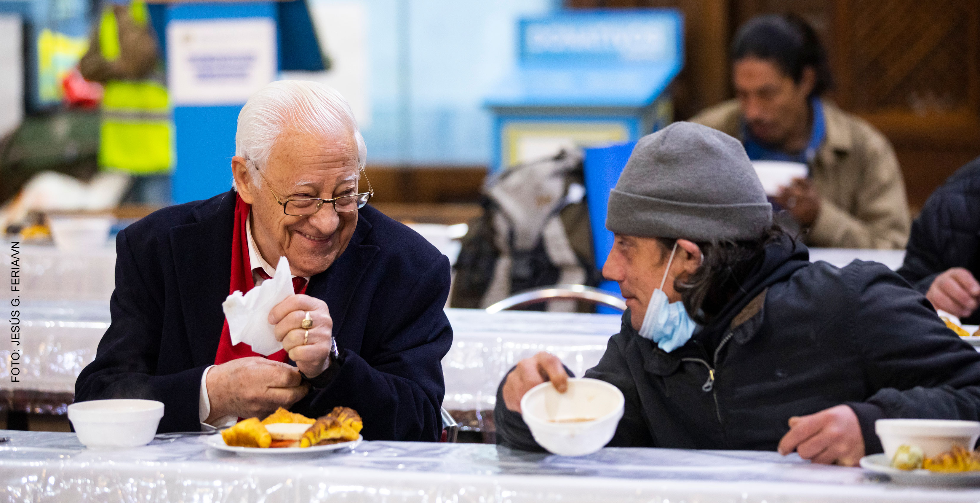 Ahora sí, el padre Ángel puede tomar el pan y el vino en una mesa en la que caben todos. En cuanto concluye la liturgia, baja los cuatro escalones, coge un tazón y se sienta al lado de sus invitados como uno más, haciéndose el encontradizo, buscando conversación para ver cómo se le podría rescatar de la calle. Pero también para que no se le olvide que el resto de su implacable agenda salpicada de políticos, empresarios y gente del colorín solo tiene sentido si empieza y termina con y por los últimos.