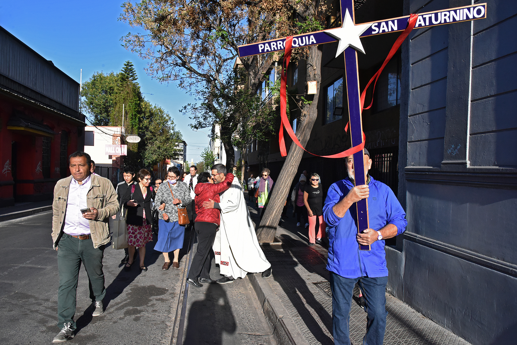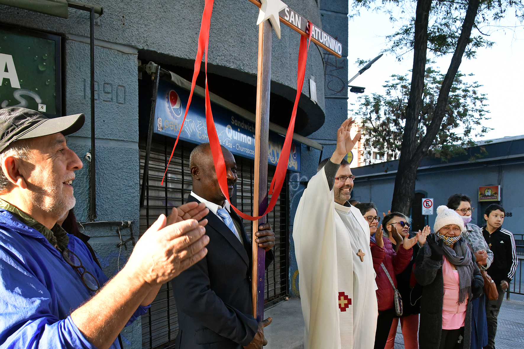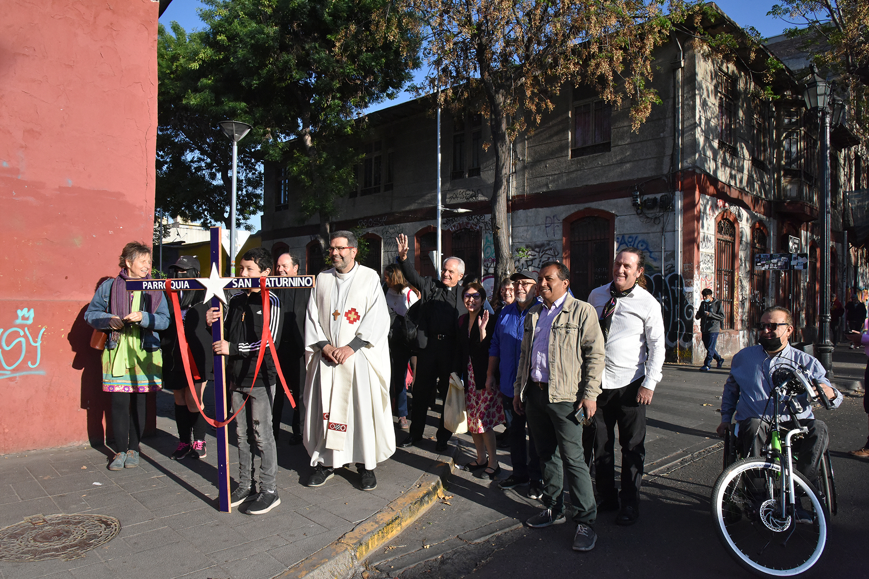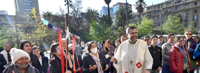En su emotivo discurso de agradecimiento tras la ceremonia, el misionero español describió esta honda experiencia humana y espiritual: “Yungay es un barrio patrimonial precioso. Ahí hay personas maravillosas. Ahí fui enviado a cuidar una porción del pueblo de Dios de nuestra Iglesia de Santiago. Llegué desolado y el Señor curó mis heridas con el aceite del consuelo y el vino de la esperanza en la entrañable comunidad de san Saturnino y con mis hermanos migrantes, sobre todo haitianos de Fundación Frè. Estoy eternamente agradecido a mis amigos vecinos del barrio, que hoy han decidido acompañarme peregrinando desde nuestra parroquia. ‘Con un oído en el pueblo y otro en el Evangelio’ ha sido más que un lema pintado por los jóvenes en el muro frontal de la parroquia frente a la Plaza del Roto chileno. Es un modo de vida, un estilo de evangelización. Solemos decir que nuestra parroquia es el barrio. Y todos juntos, creyentes y no creyentes, hemos organizado la esperanza y aliviado el sufrimiento de nuestros vecinos y vecinas, especialmente adultos mayores, migrantes, personas en situación de calle y familias vulnerables. Por eso, el báculo que porto está hecho en el Museo Taller del barrio. ¡Gracias, Yungay!”.