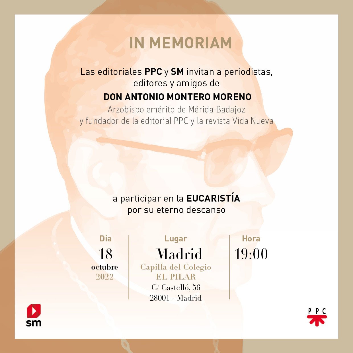 Las editoriales PPC y SM invitan a periodistas, editores y amigos de Antonio Montero Moreno, arzobispo emérito de Mérida-Badajoz y fundador de la editorial PPC y la revista Vida Nueva a participar en la eucaristía por su eterno descanso.