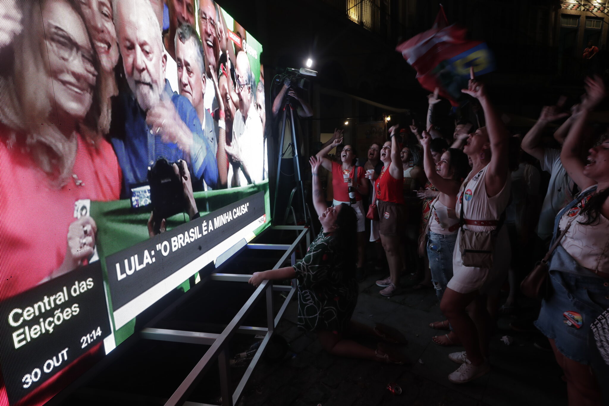 -FOTODELDÍA- AME9763. RÍO DE JANEIRO (BRASIL), 30/10/2022.- Simpatizantes del expresidente Luiz Inácio Lula da Silva observan su discurso hoy, en Río de Janeiro (Brasil). El exmandatario Luiz Inácio Lula da Silva ganó este domingo la segunda vuelta de las elecciones presidenciales en Brasil con un 50,83 % frente al 49,17 % que obtuvo el actual gobernante, Jair Bolsonaro, con el 98,81 % de las urnas escrutadas. EFE/ Antonio Lacerda