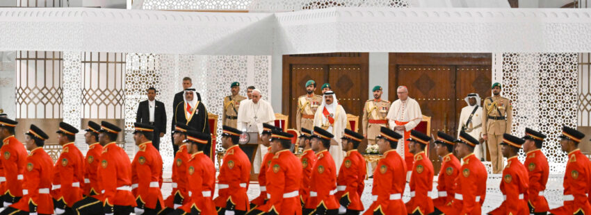 El Rey Hamad bin Isa ha pronunciado un clásico discurso en el que ha presentado a Bahrein como “un país de tolerancia, convivencia y paz”, donde durante siglos se ha desarrollado “un clima abierto y tolerante que abrazó a diversas culturas y religiones con amor y acogida”, e invitó al Papa a conocer esta su “tierra de convivencia entre los seguidores de las diversas religiones donde todos, bajo nuestra protección y la de Allah, disfrutan de la libertad de ejercer su propio credo y construir sus lugares de culto en una clima de amistad, sintonía y reconocimiento recíproco”. Y a este propósito recordó la Declaración del Reino de Bahrein, lanzada hace algunos años, como “un documento que invoca la diversidad y rechaza la discriminación religiosa y condena la violencia y la incitación a la violencia”.
