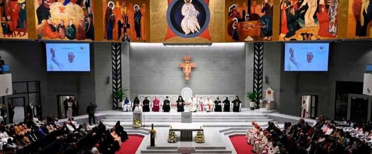 Solo un kilómetro separa la Mezquita del Palacio Real de la Catedral de Nuestra Señora de Arabia. El Papa lo recorrió en su pequeño utilitaria y poco antes de las seis de la tarde (las cuatro en España) hizo su ingreso en este templo construido gracias al regalo de nueve mil metros cuadrados que hizo el Rey Hamad bin Isa el 11 de febrero del 2013, festividad de Nuestra Señora de Lourdes.