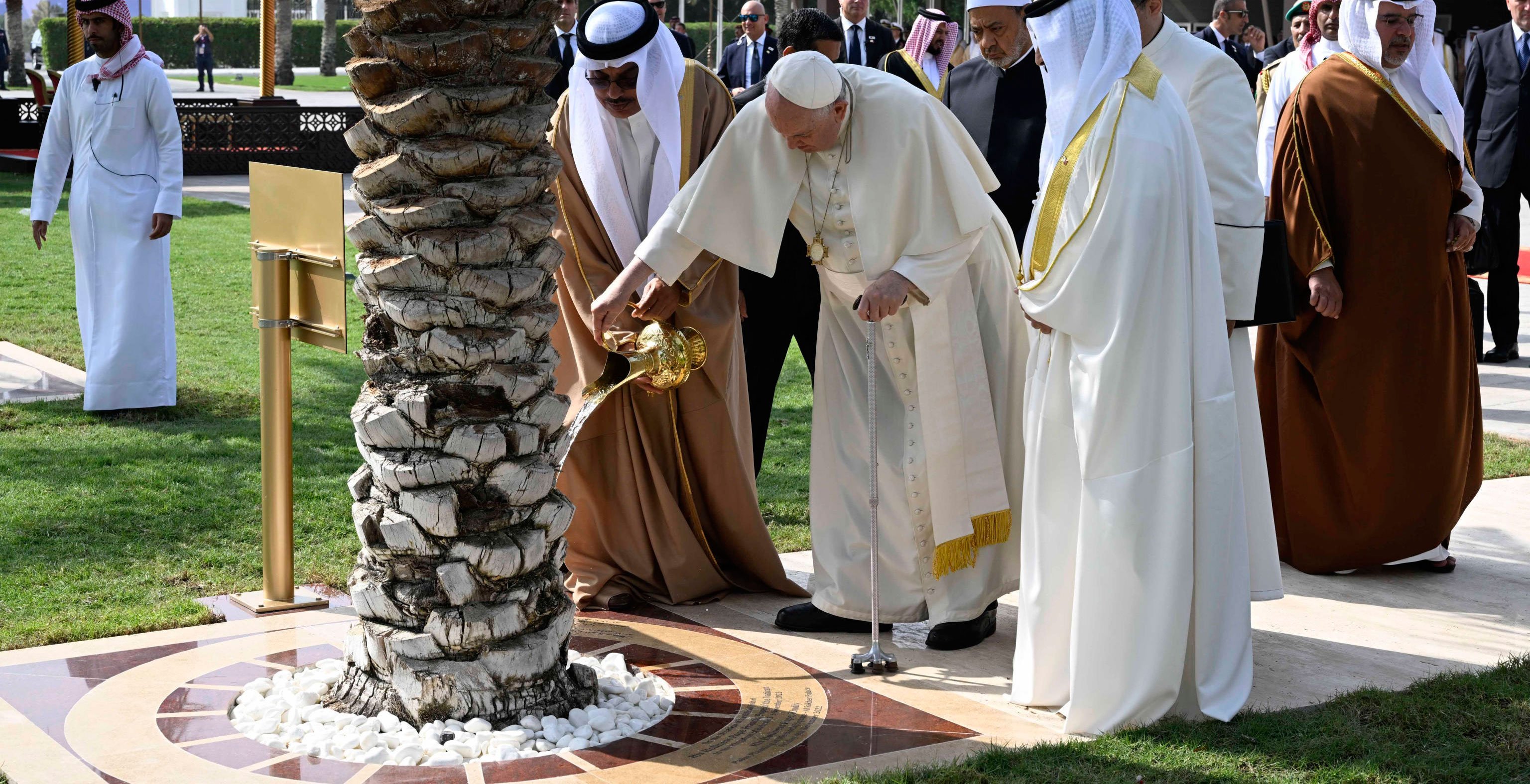 Al inicio de esta ceremonia a la que Bergoglio llegó en su modesto FIAT 500 pero escoltado por un flamante batallón a caballo de la guardia real, se plantó un árbol que regaron sucesivamente el Rey, el Papa y el Gran Imán .