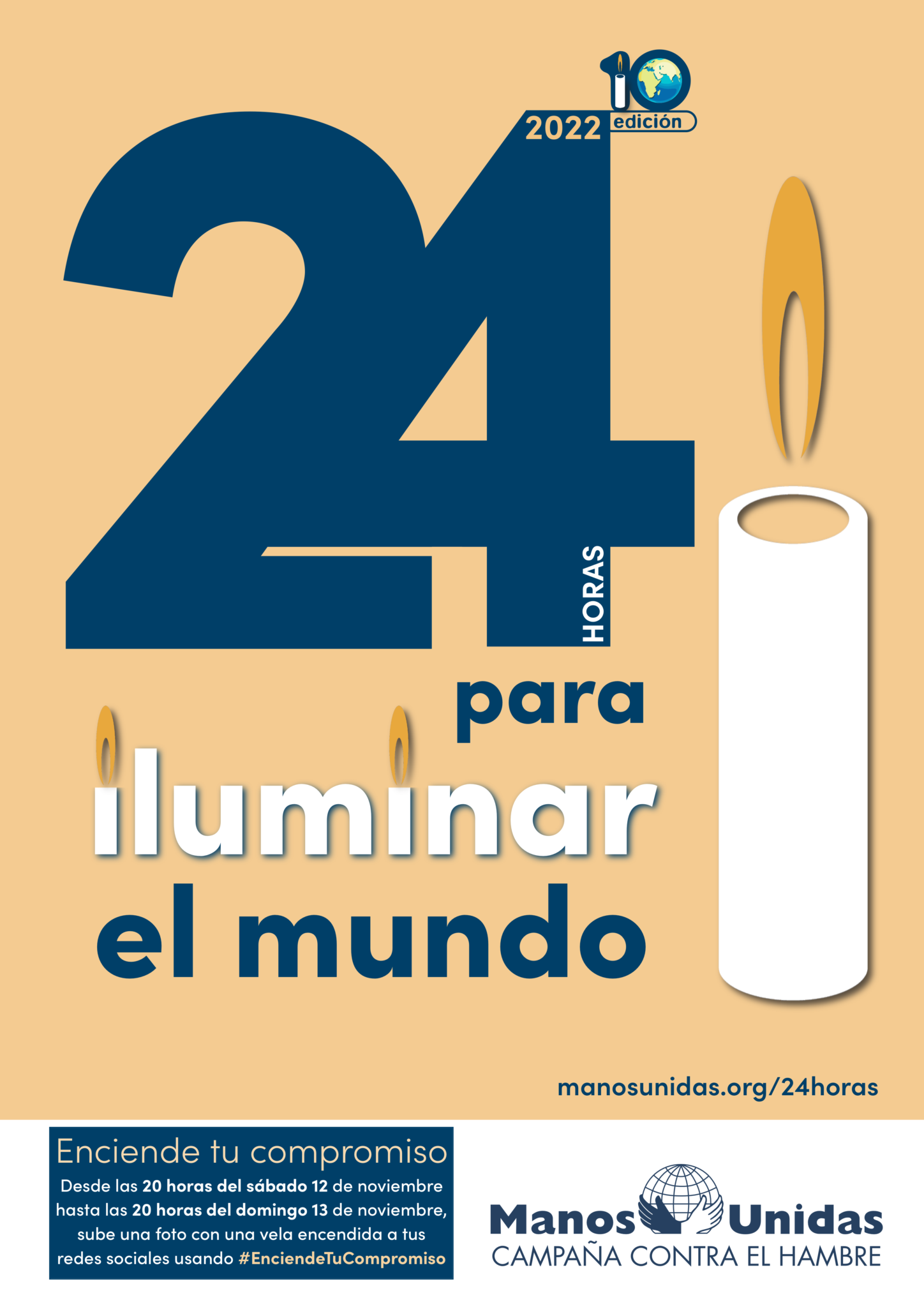 Desde las 8 de la tarde del sábado 12 de noviembre y hasta las 8 de la tarde del domingo 13, Manos Unidas lanza la 10ª edición de su propuesta “24 horas”. Una iniciativa para mostrar la esperanza en medio de las dificultades del mundo compartiendo fotografías con una vela a través de la página web creada para la ocasión.