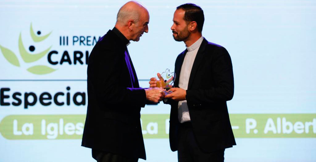 Pedro Andrés Miguel, provincial de los combonianos, recibe el premio en nombre de Eugenio Arellano de manos de Manuel Bretón, presidente de Cáritas