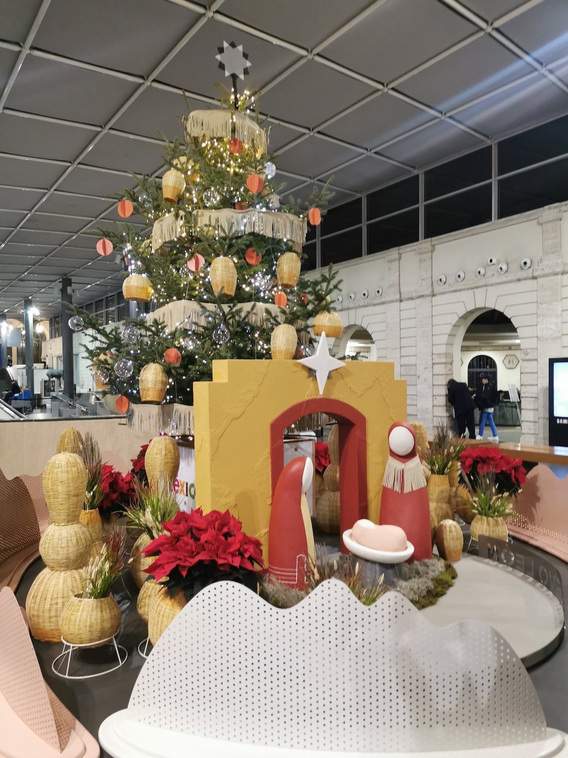 Las figuras que representan a Jesús, María y José fueron fabricadas en estructura de acero con textil que incorpora gráficos del vestuario de Polka y Flequillos de las chaquetas típicas de Nuevo León.
