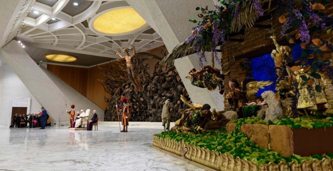 El Papa, además de destacar el elemento del pesebre subrayó que es una característica de Dios mismo que se despoja de todo para asumir la humanidad. En un “signo que nos muestra el ‘estilo’ de Dios, que es cercanía, compasión y ternura”. “De manera que Dios hecho niño, pequeño y humilde, con su amor, es capaz de atraernos”, añadió frente a las veces en que las personas se muestras como “hierro”, es decir “somos duros, rígidos, fríos”, expuso el pontífice comenta una carta del Doctor del Amor Divino. “Dios ha encontrado el medio de atraernos seamos como seamos: con amor. No un amor posesivo y egoísta, como desgraciadamente suele ser el amor humano. Su amor es puro don, pura gracia, es todo y sólo para nosotros, para nuestro bien”, añadió. Para Francisco, el de Dios “es un amor ‘sin armas’ y que desarma a los demás”.