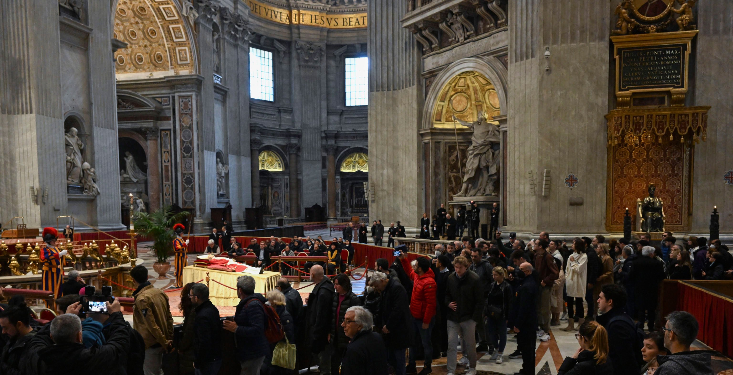 Al reloj le faltan solo unos minutos para dar las cinco de la tarde. La Basílica de San Pedro guarda su habitual olor a incienso, pero el silencio se hace más evidente que nunca. Se cuentan por miles los fieles que hoy, llegados de todo el mundo -con la normal mayoría italiana-, han querido pasar por la capilla ardiente de Benedicto XVI para dar el último adiós al que para todos será siempre el papa emérito, el único que hemos conocido en los últimos 600 años.