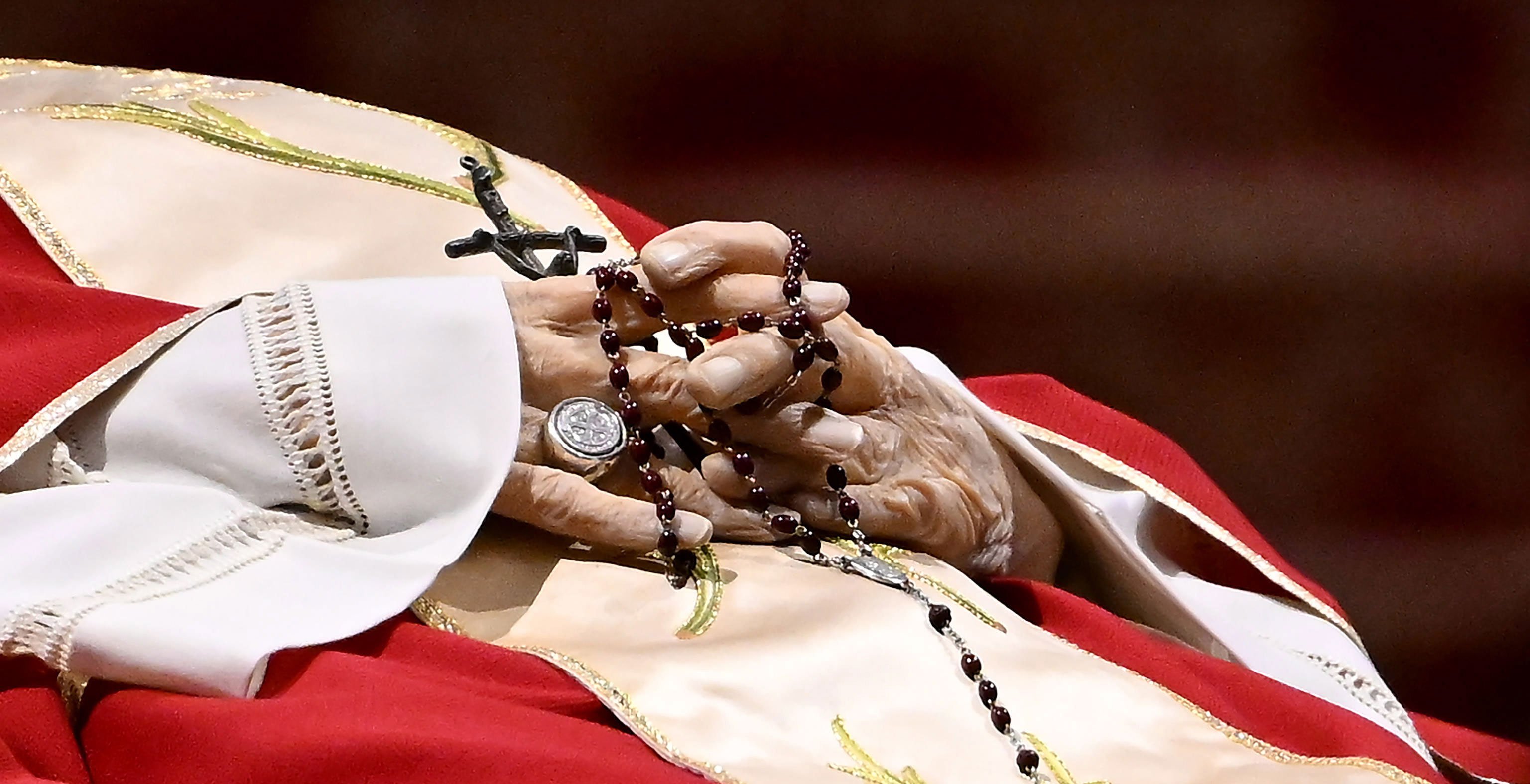 Impresiona estar a solo cuatro metros del cuerpo del Papa alemán custodiado por dos guardias suizos que permanecen inmutables. Benedicto XVI yace rosario en mano con la casulla roja que portaba en la clausura de la Jornada Mundial de la Juventud de Sídney, una mitra blanca y unos zapatos negros ortopédicos. Ni rastro de los famosos zapatos rojos que lleva sin vestir desde su renuncia. Tampoco porta palio ni cruz pectoral alguna.