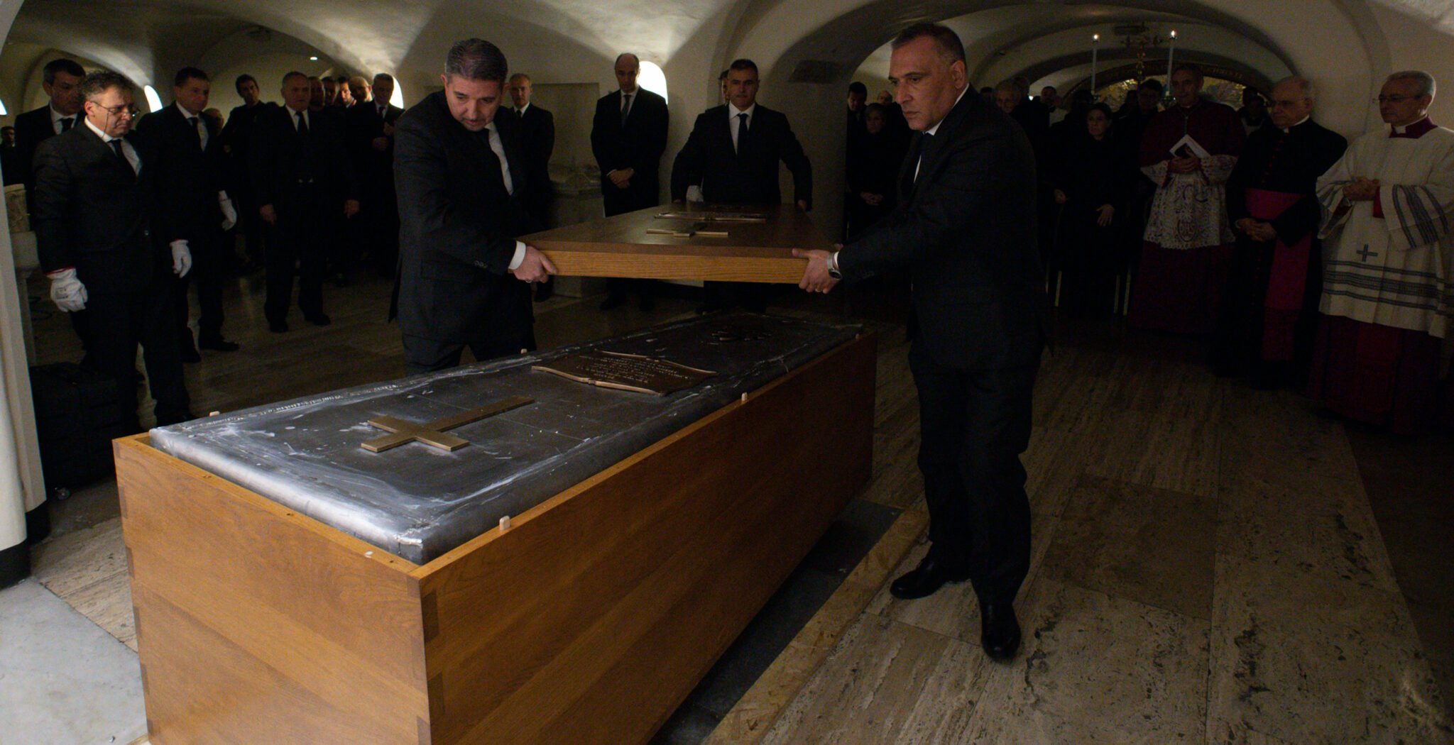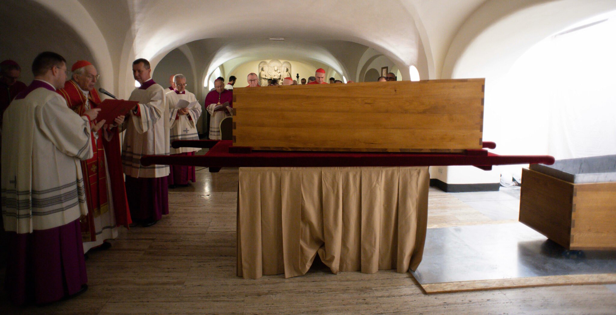 El cuerpo sin vida de Benedicto XVI yace en la sepultura que en su día ocuparan dos de sus predecesores, como Juan XXIII y Juan Pablo II, a este último, Joseph Ratzinger fue el encargado de despedir en un funeral presidido por él como decano del Colegio cardenalicio el 8 de abril de 2005. Antes de ser inhumado, siguiendo la tradición, el ataúd de ciprés forrado de terciopelo carmesí que se empleó en la misa fue introducido en un segundo féretro de zinc sellado y lacrado y este tercer en otro de madera de olmo. Algo que los fotógrafos de los medios vaticanos han inmortalizado y que el cabildo de San Pedro ha velado para que así se haga correctamente.