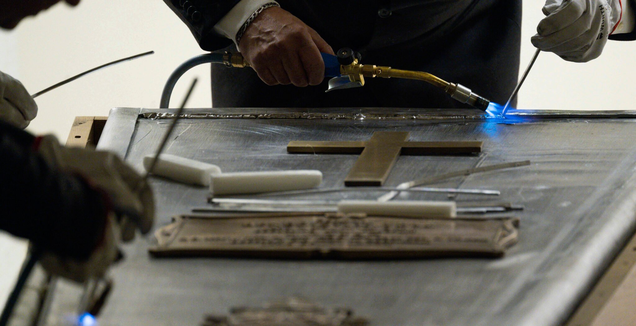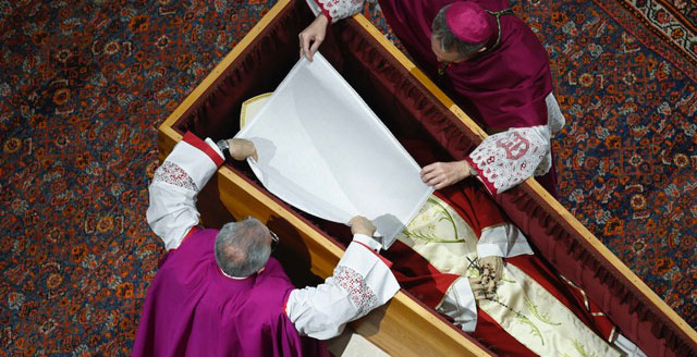 El secretario personal de Benedicto XVI, el arzobispo alemán Georg Gänswein, fue el encargado ayer, al cerrarse la capilla ardiente a las 19:00 horas, de colocar el cuerpo en el ataúd, con la ayuda del maestro de la Oficina para las Celebraciones Litúrgicas Pontificias, el sacerdote italiano Diego Giovanni Ravelli.