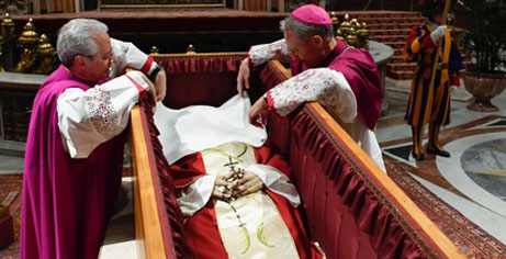 Diez sediarios, los antiguos portadores de la Silla Gestatoria de los Papas, cargaban a Benedicto XVI a sus hombros rumbo a la basílica, para trasladarlo luego a las grutas vaticanas para darle sepultura.