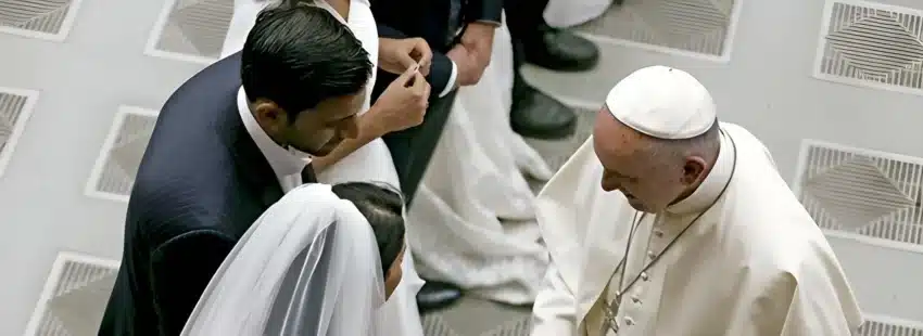 “Esta hermosa visión puede parecer utópica”, ha afirmado, “ya que no parece tener en cuenta la fragilidad humana, la inconstancia del amor”. “La indisolubilidad se concibe a menudo como un ideal, y tiende a prevalecer la mentalidad según la cual el matrimonio dura mientras hay amor”, ha continuado Francisco. “En cambio, el amor conyugal es inseparable del matrimonio mismo, en el que el amor humano, frágil y limitado, se encuentra con el amor divino, siempre fiel y misericordioso”.