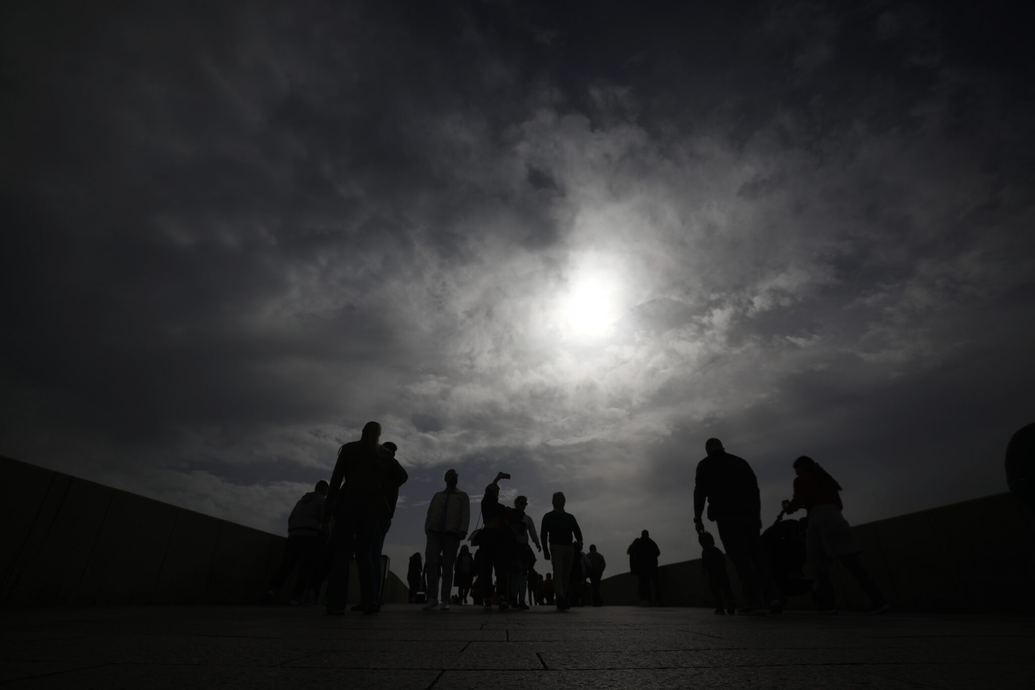 CÓRDOBA, 18/02/2023.- Varias personas caminan por el puente Romano de Córdoba con un sol tapado por la calima subida de temperaturas. EFE/Salas