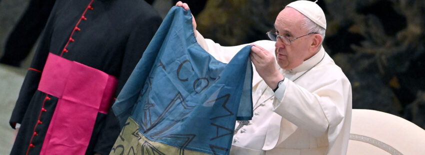 Al terminar su catequesis del 6 de abril, Francisco lamentó la reciente masacre en la localidad de Bucha, a las afueras de Kiev, y las crueldades “cada vez más horrendas que sufren los civiles, mujeres y niños inermes”. Desde que se desató la invasión por parte de Rusia, los ucranianos se han convertido en víctimas “cuya sangre inocente grita hasta el cielo e implora que se ponga fin a esta guerra y se haga callar a las armas y se deje de sembrar muerte y destrucción”. Después de pedir oraciones ante este drama a los fieles presentes, el Pontífice mostró una bandera ucraniana, que según dijo le habían enviado desde Bucha.