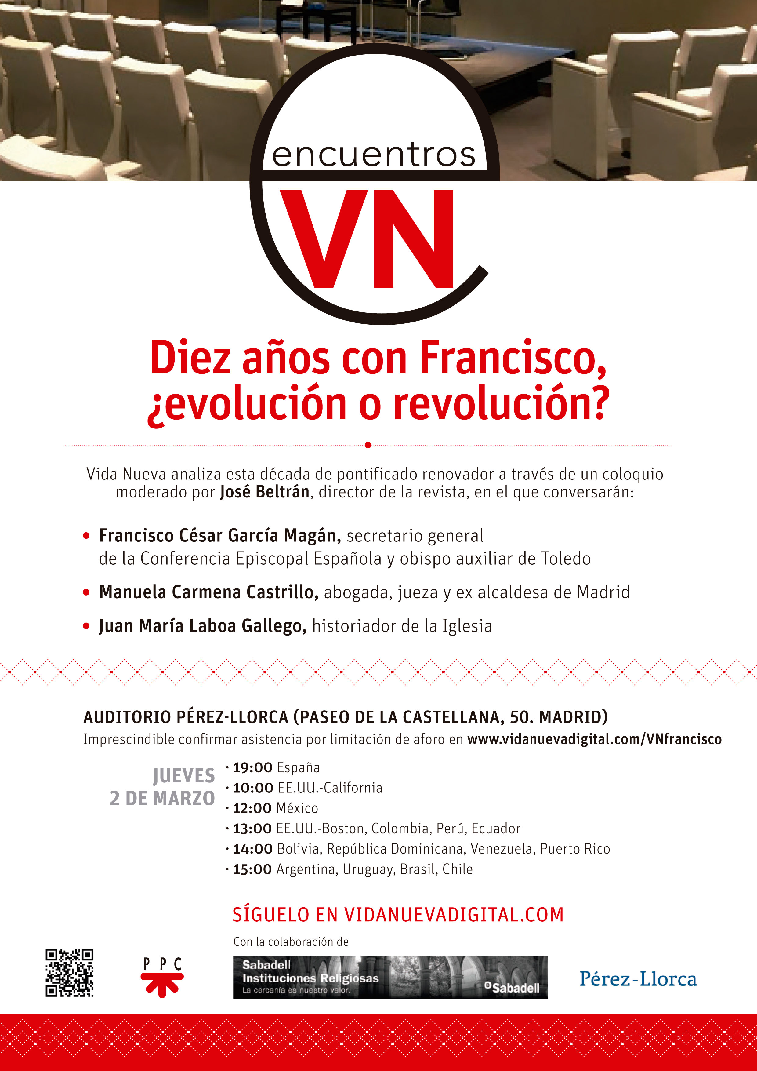 El Encuentro que analizará esta década de pontificado renovador contará con la participación del autor; la abogada, jueza y ex alcaldesa de Madrid, Manuela Carmena; y el secretario general de la Conferencia Episcopal Española y obispo auxiliar de Toledo, Francisco César García Magán. La mesa estará moderada por el director de Vida Nueva, José Beltrán. Los tres ponentes reflexionarán en torno a los diez años de pontificado del papa Francisco.