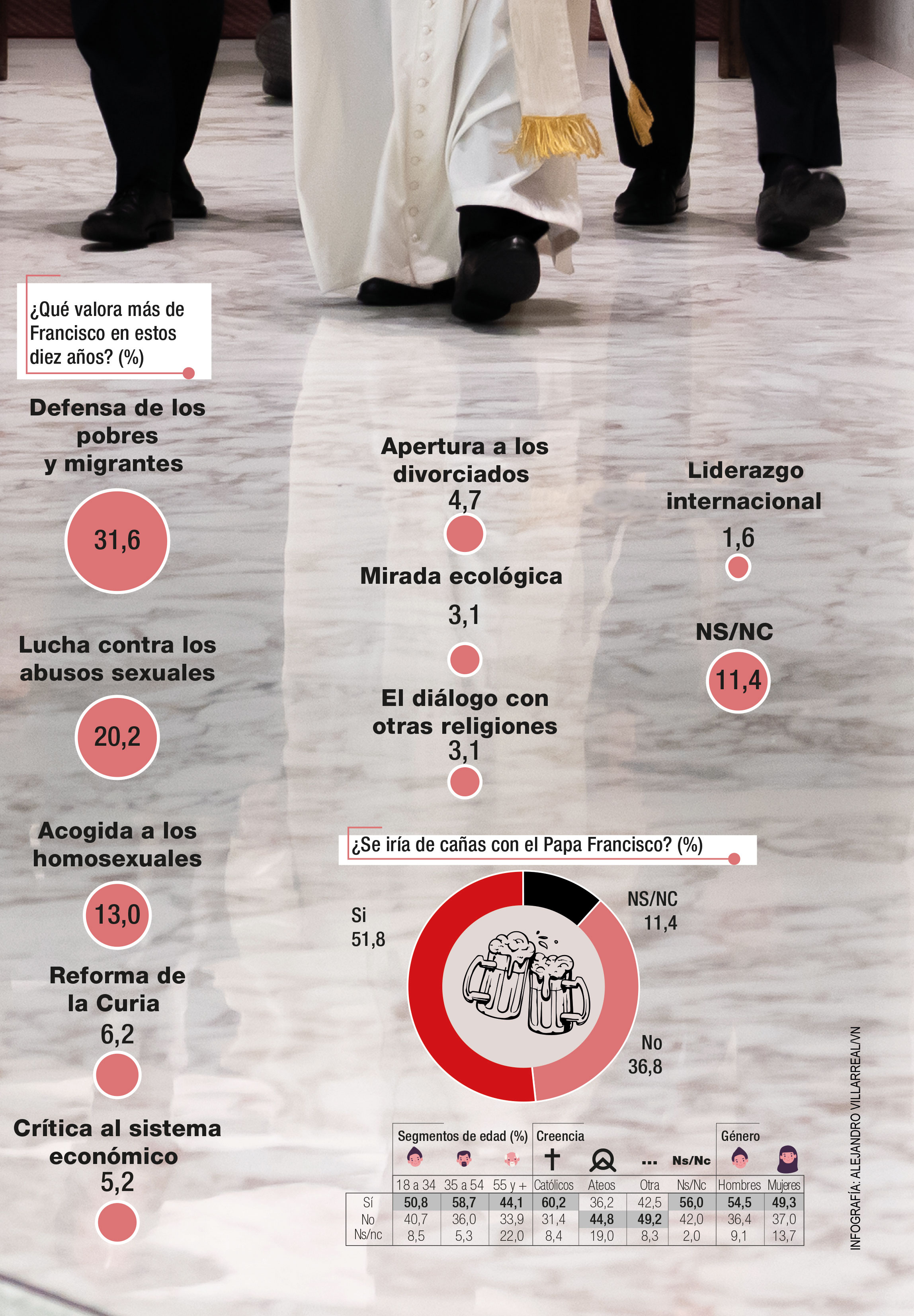 El 51,8% de los encuestados se iría de cañas con el papa Francisco. Por otra parte, un 36,8% rechazaría el plan. Los más proclives a aceptar son los adultos de entre 35 y 54 años (58,7%), y los que menos los mayores de 55 años (44,1%). Viendo las respuestas por género, el 54,5% de los que aceptarían son hombres y el 49,3% mujeres.